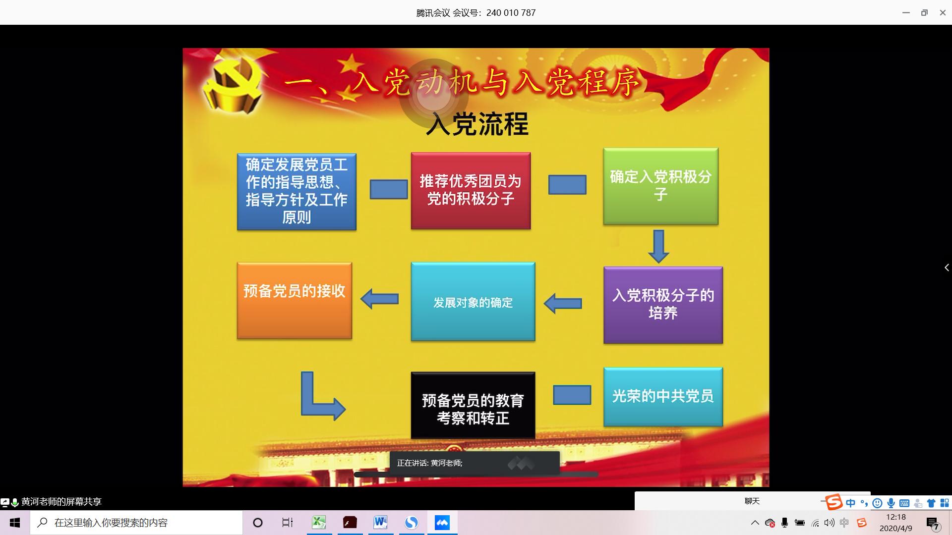 4月9日中午12点,2026年世界杯官网通过在线会议APP举行了第49期入党积极分子培训,由舞蹈系员工党支部书记黄河担任主讲人,开展‘如何充分发挥老员工党员先锋模范作用’的专题讲座。