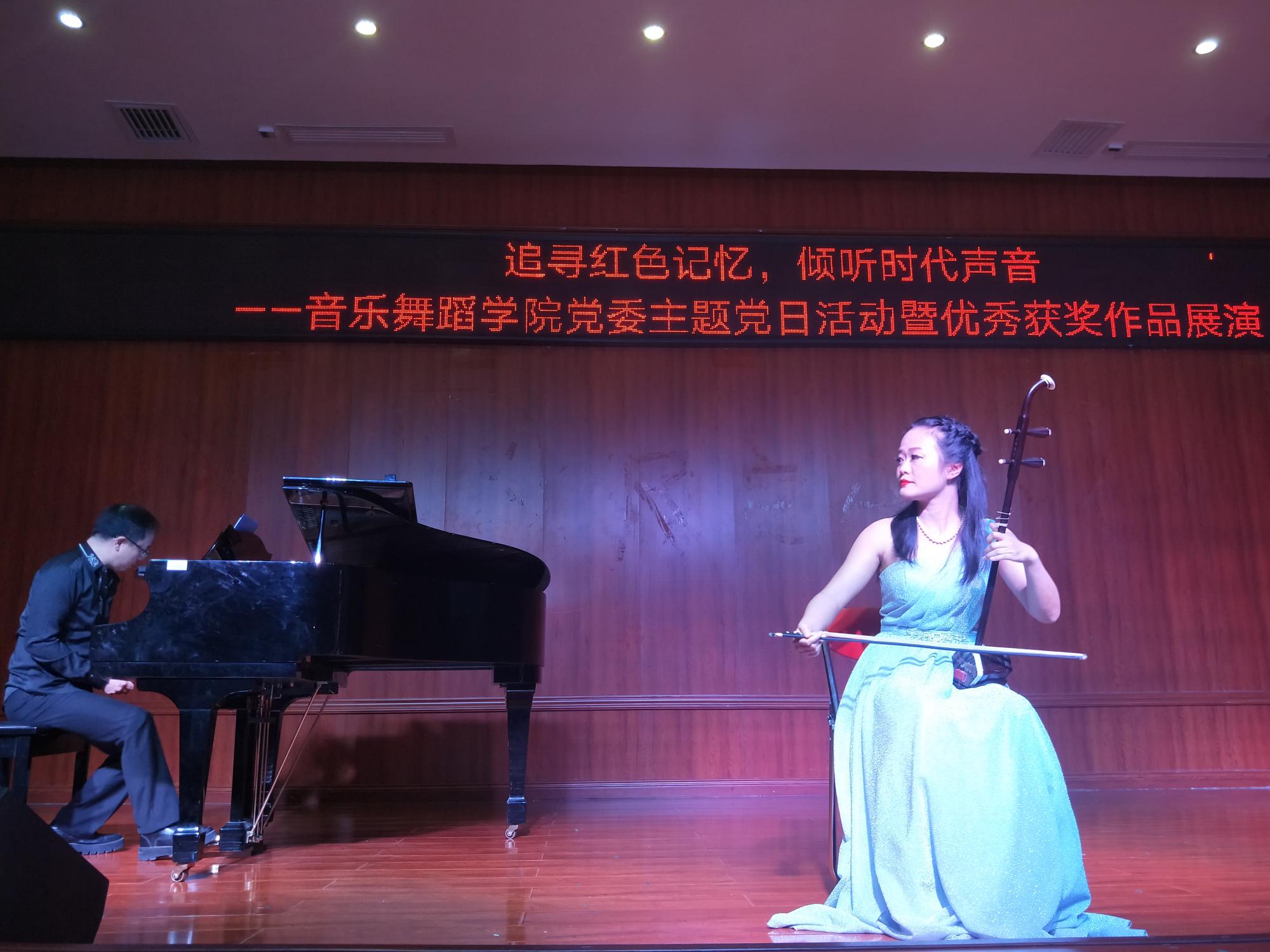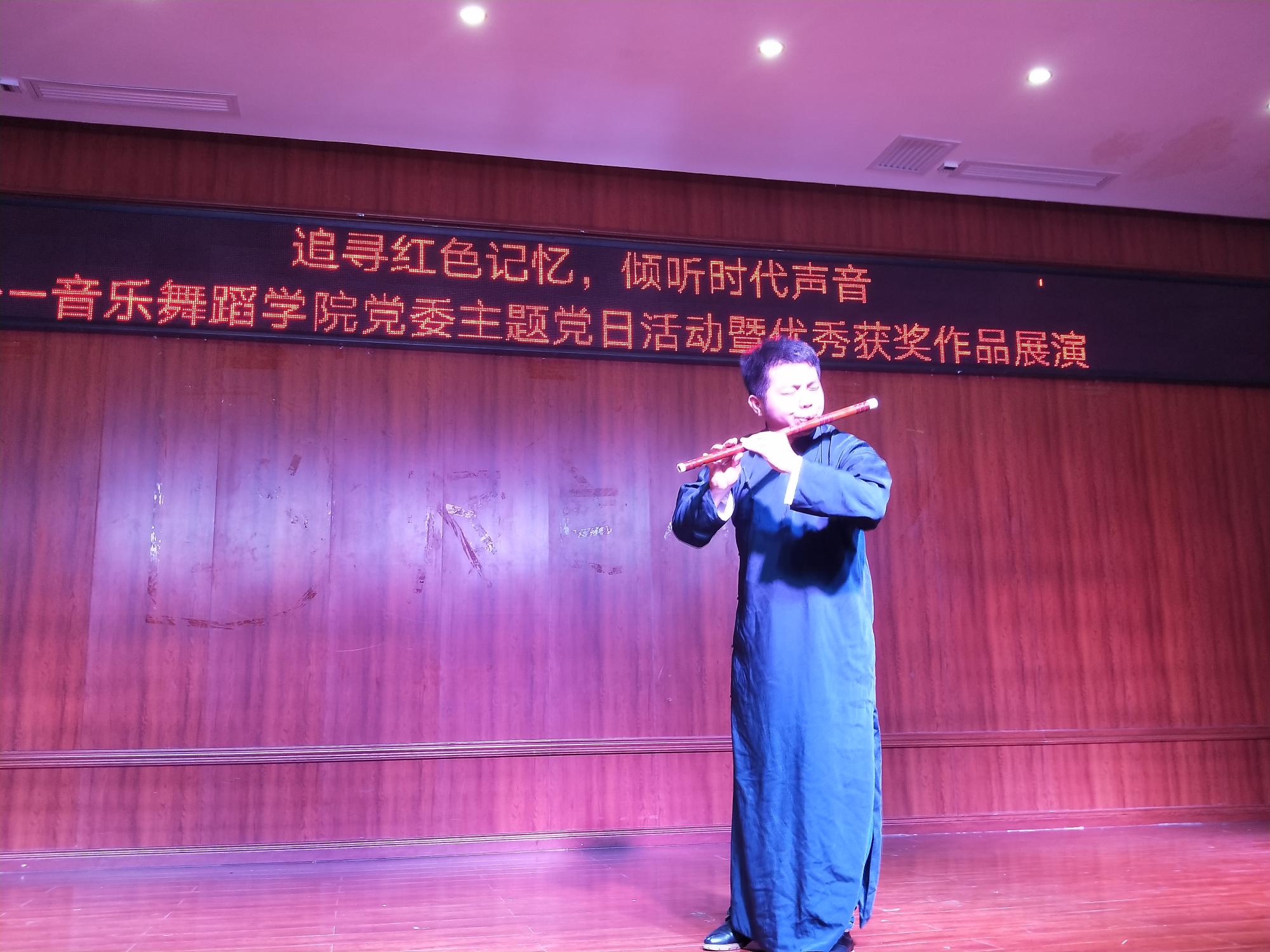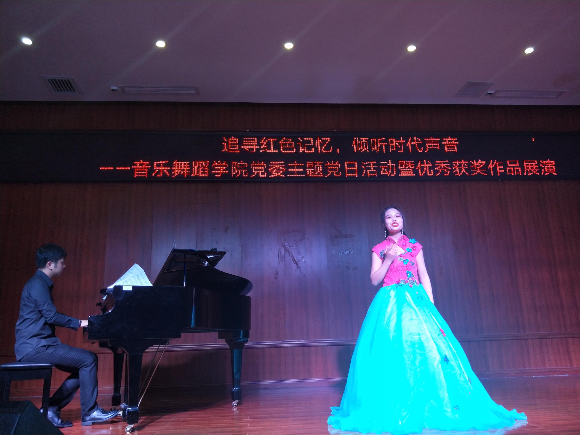 随后,主题党日活动通过声乐演唱、器乐演奏、舞蹈表演等形式展开。男女声二重唱《江山》、《不忘初心》,舞蹈《背水一战》、《笙声》,独唱《永远跟党走》、《亲吻祖国》,器乐合奏《红梅随想曲》、《山丹丹花开红艳艳》等,将师生党员们带入了那段烽火燃烧的岁月。一曲《我为共产主义把青春献》,更是让全体党员深切感受到了革命先辈为了党、为了新中国抛头颅、洒热血的艰苦奋斗史和伟大血泪史,演唱引发强烈共鸣、催人泪下,不得不让人为之动容。