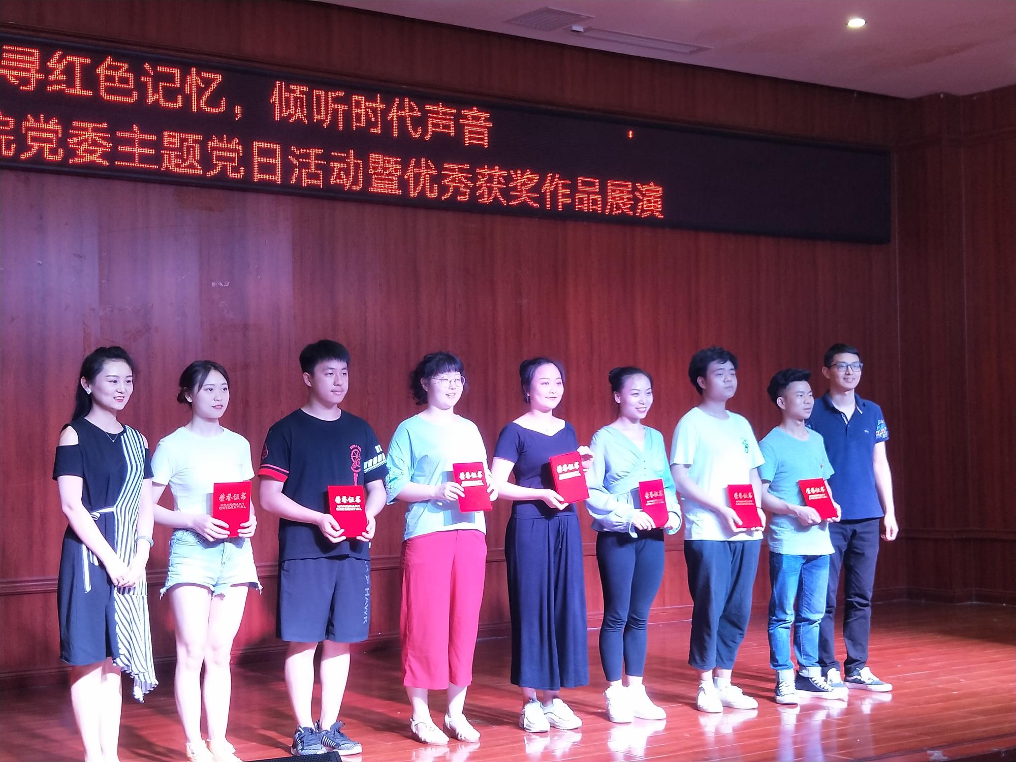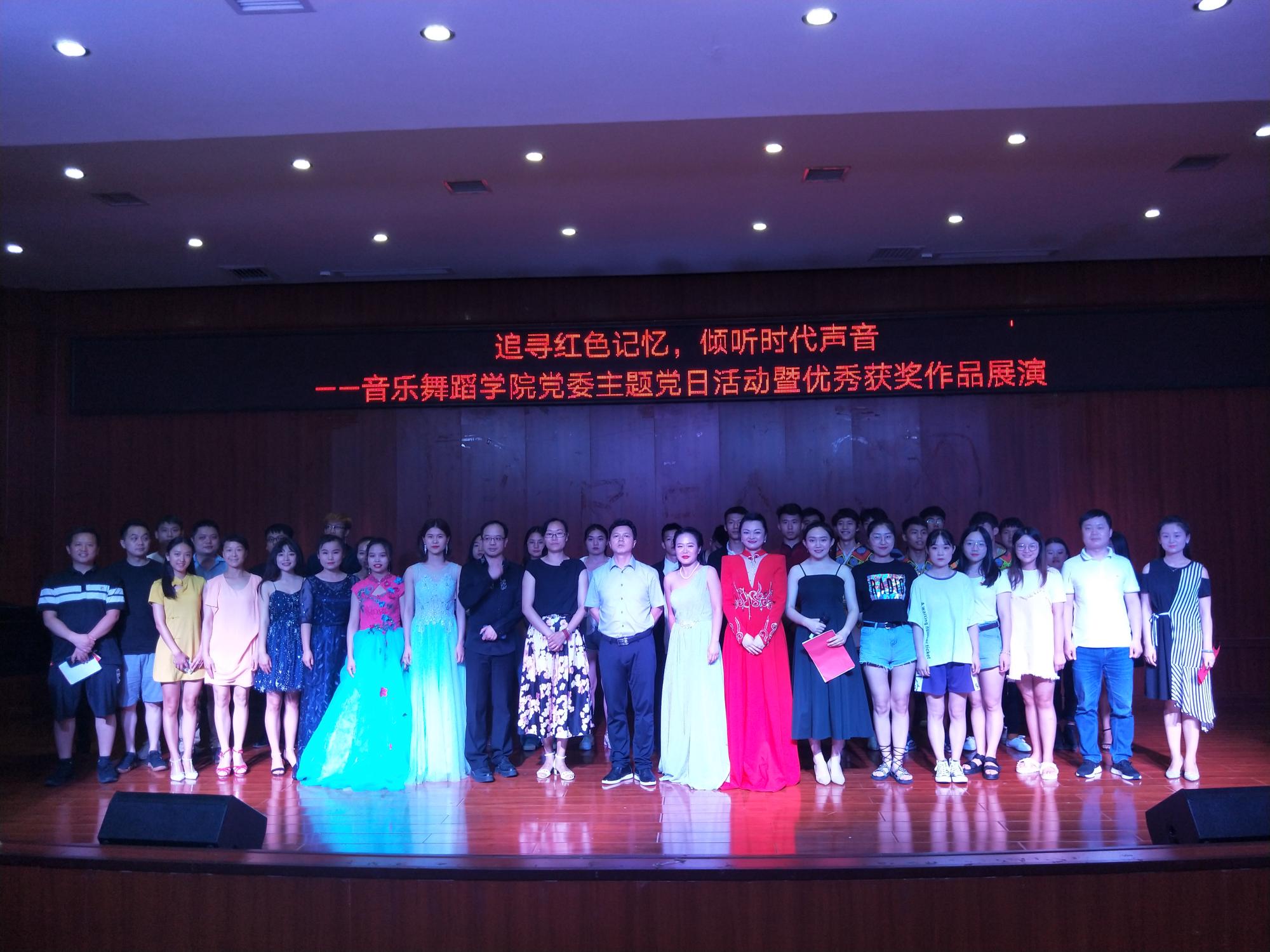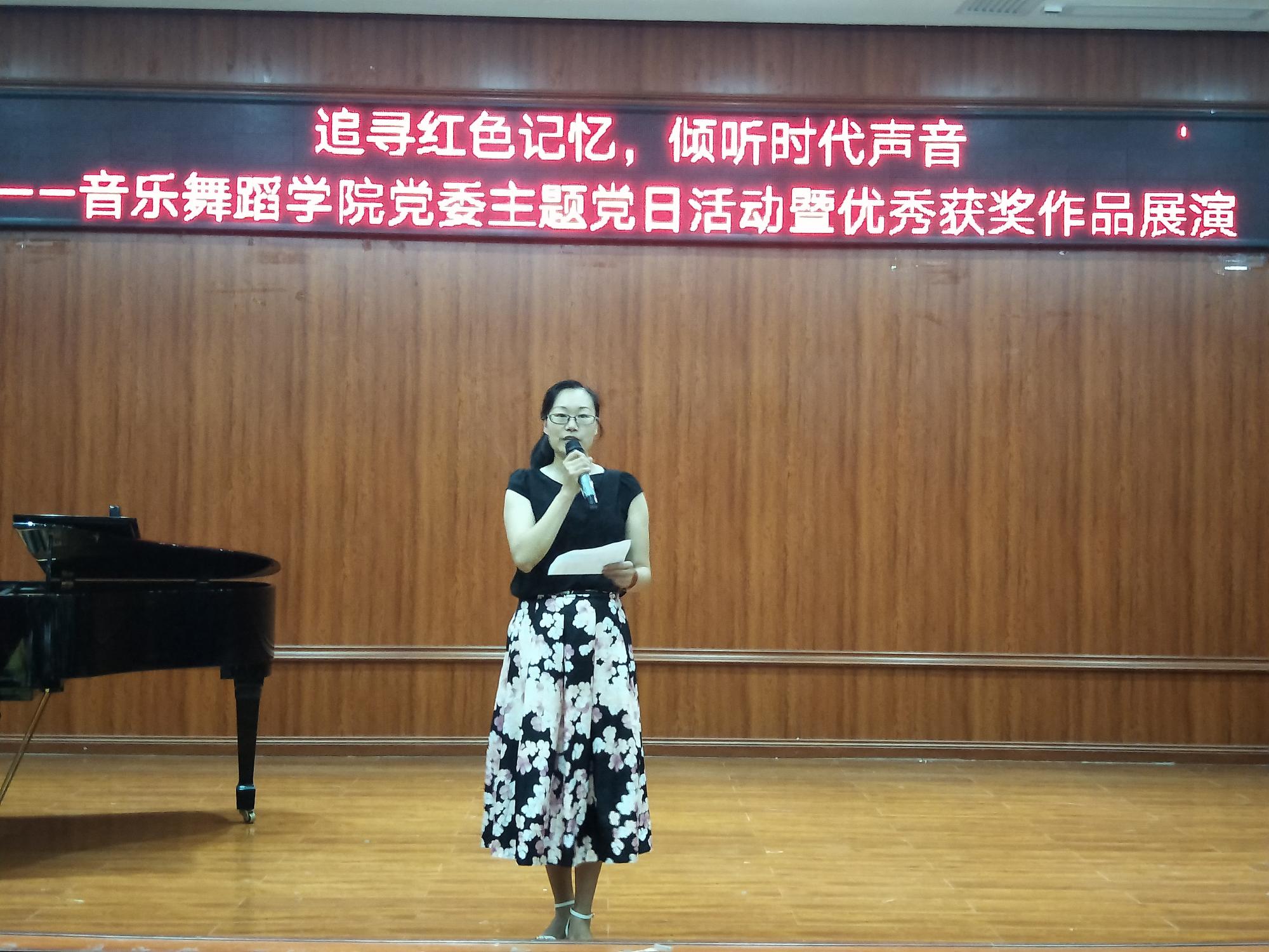 随后,主题党日活动通过声乐演唱、器乐演奏、舞蹈表演等形式展开。男女声二重唱《江山》、《不忘初心》,舞蹈《背水一战》、《笙声》,独唱《永远跟党走》、《亲吻祖国》,器乐合奏《红梅随想曲》、《山丹丹花开红艳艳》等,将师生党员们带入了那段烽火燃烧的岁月。一曲《我为共产主义把青春献》,更是让全体党员深切感受到了革命先辈为了党、为了新中国抛头颅、洒热血的艰苦奋斗史和伟大血泪史,演唱引发强烈共鸣、催人泪下,不得不让人为之动容。