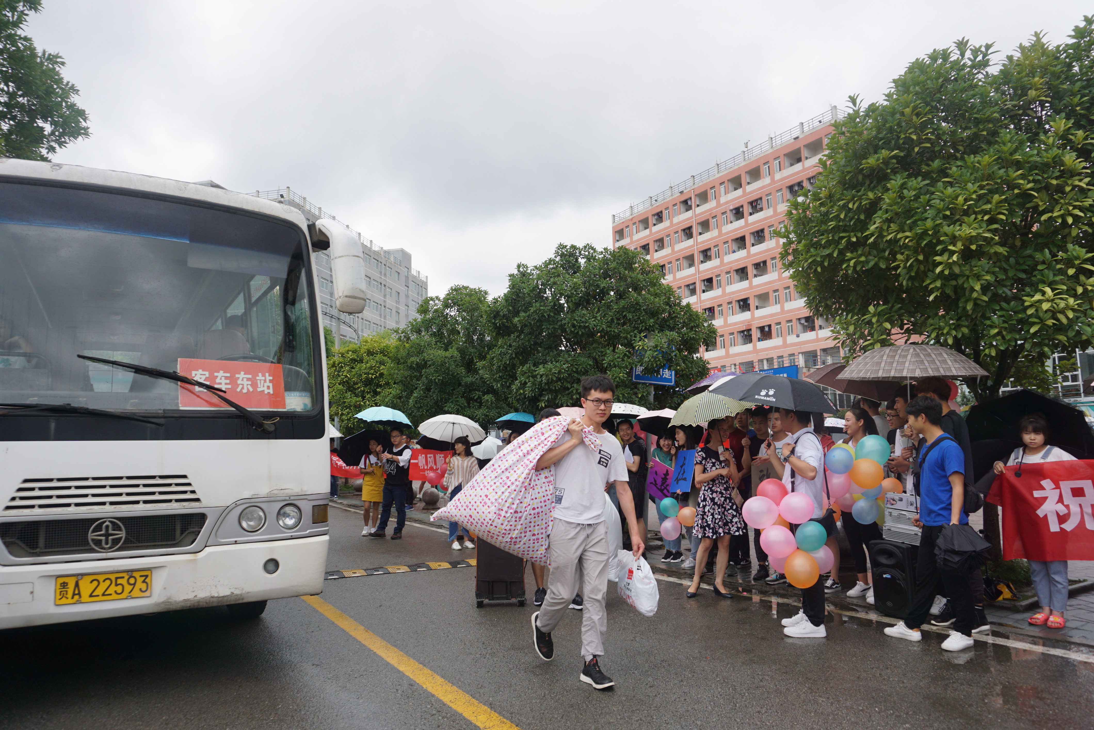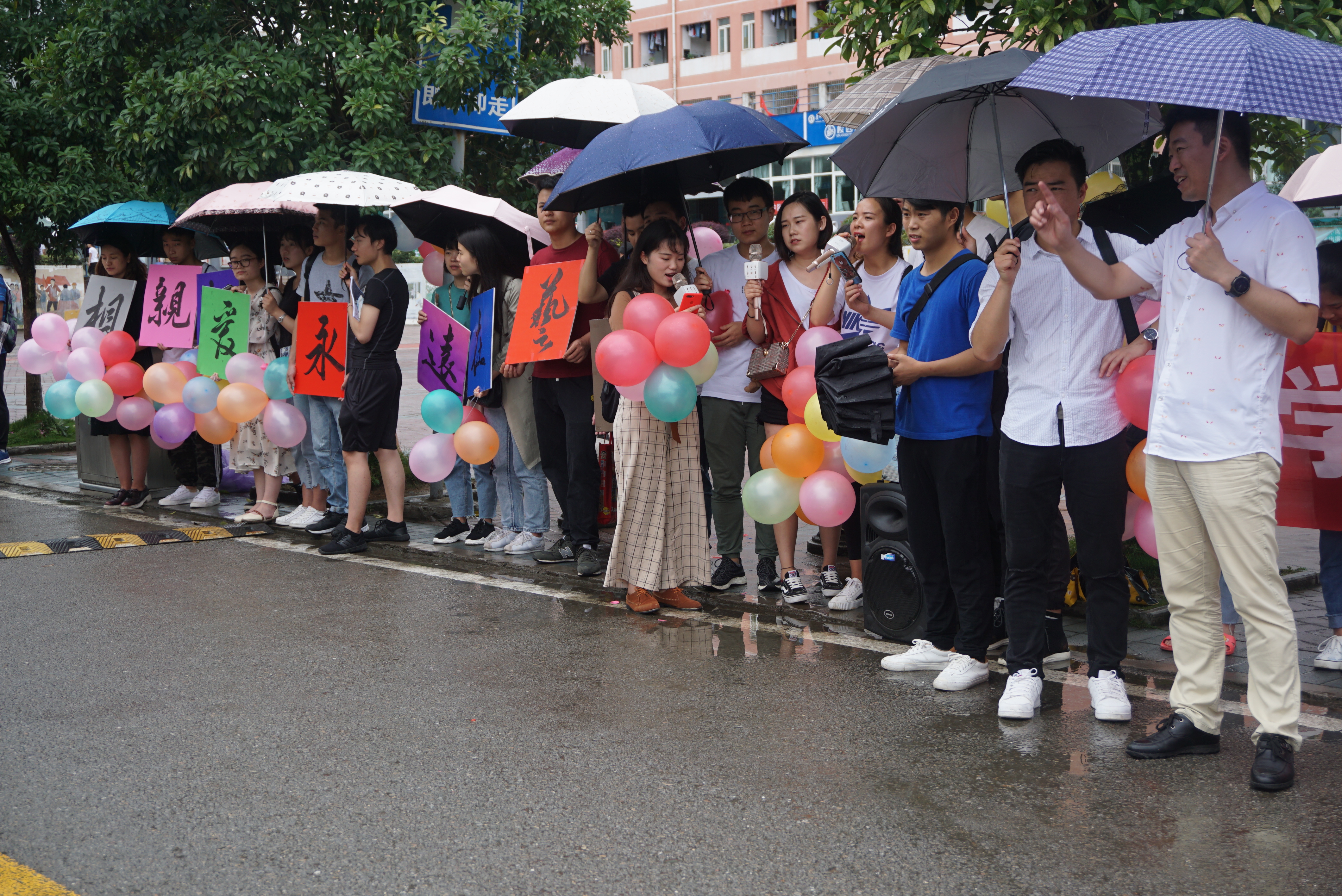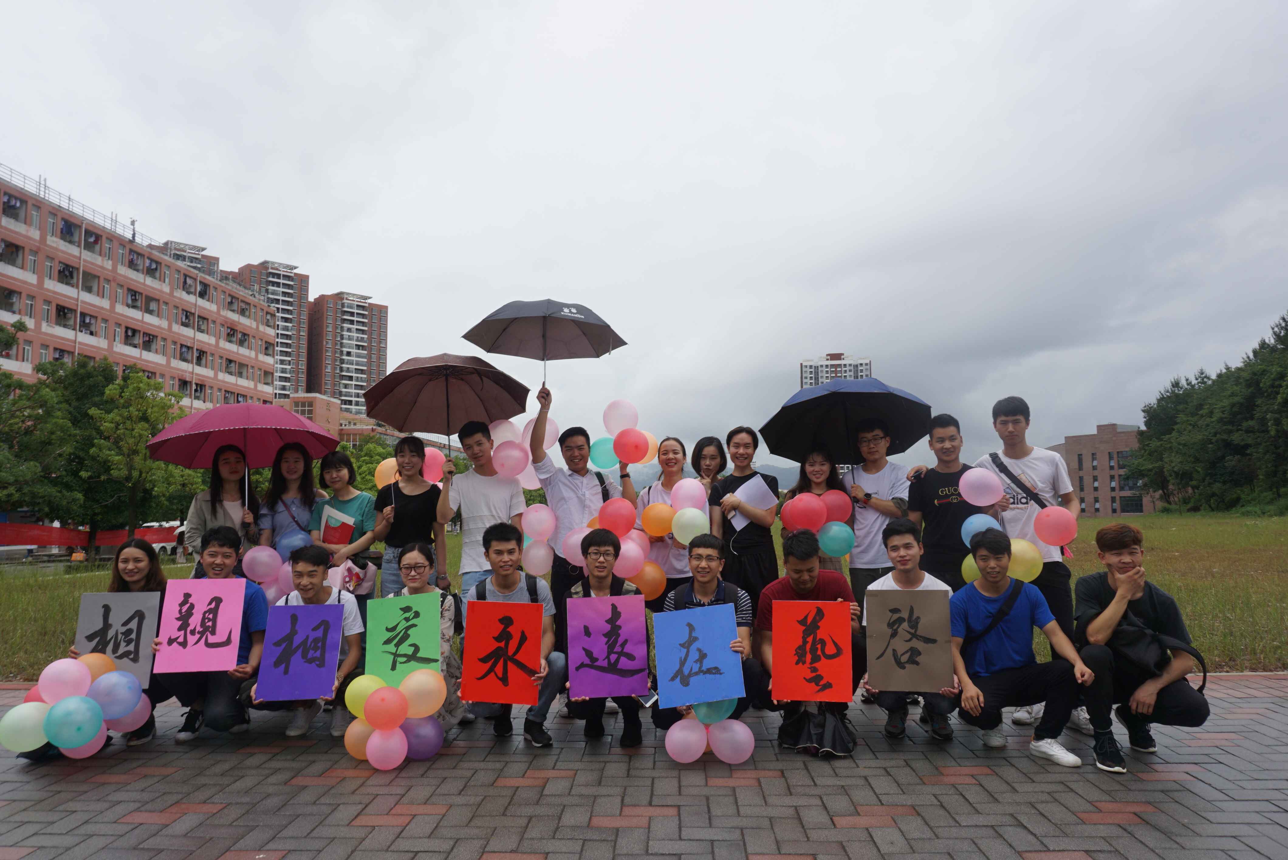 绵绵细雨,伴随歌声,支委同学大清早就开始准备相关工作。搬音响、打气球、绘图......一切准备就绪,大家集合一起出发,前往送别之程。员工党员带领广大同学一路放着轻快的歌曲抵达奋斗广场,有序的整队集合,高举院牌、挥舞院旗,高喊:我们相亲相爱,我们永远在一起!