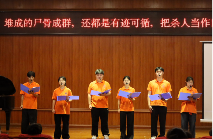 随后,整场活动的核心环节——艺术思政“微团课”主题展演惊艳亮相。展演以“乐-声-誓”为主线,第一篇章“乐动山河·民韵回响”通过古筝合奏《没有共产党就没有新中国》和山歌对唱《跟着民歌“游”中国》,以民族音乐解码文化基因;第二篇章“赤子心声·声情咏叹”借助电影配音与新说唱,传递了青年信念与奋斗宣言;第三篇章“誓言铮铮·艺心向党”通过情境表演《如愿》和合唱《我爱你中国》,将思想政治教育融入艺术表达,实现了思想性与艺术性的统一,完成了一堂生动的爱国主义教育课。