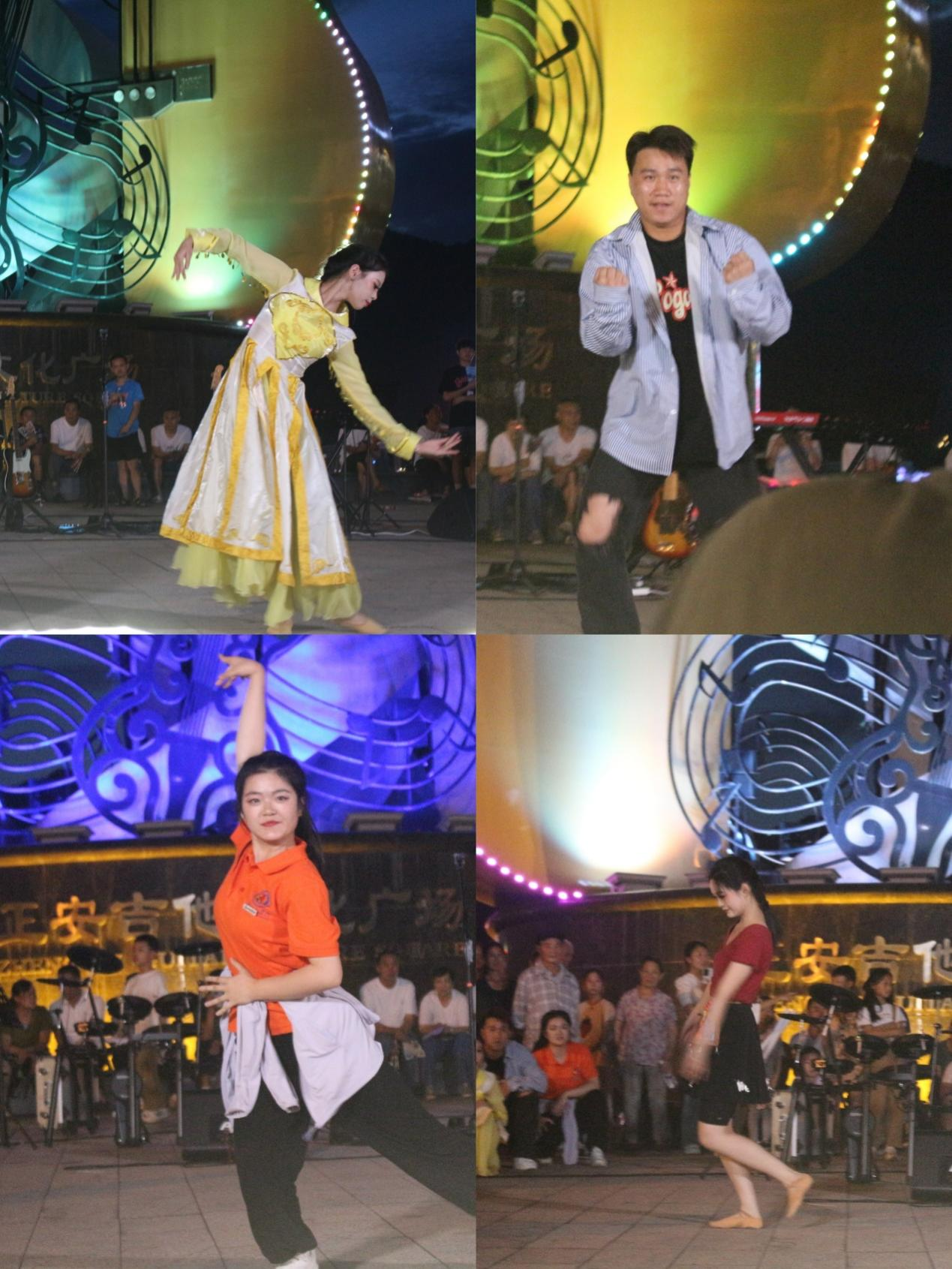 “我一路向北离开有你的季节......”,正安县吉他文化产业发展中心的黑帽子乐队深情献上《一路向北》和《一万次悲伤》,现场随即开启大合唱模式。在观众意犹未尽中,公司21级音乐学专业员工李晓艳、高立立接续带来女生二重唱《是妈妈是女儿》,展开一对母女跨越时空的深情对唱,将母爱幻化为肺腑之音,让现场观众几度感动落泪。随后,由公司员工曹青华、李桂梅、翟德开、陈林岚参演的舞蹈串烧《芳华有为》,将古典舞、街舞、拉丁舞、民族民间舞汇集呈现,以风格迥异的舞种、妙态绝伦的表现艳惊四座,此些舞蹈的专业呈现,也向民众们传达了“舞蹈”不只是“跳舞”,它更需要坚持、坚守和坚定,方能将技术与艺术融合统一、相得益彰。