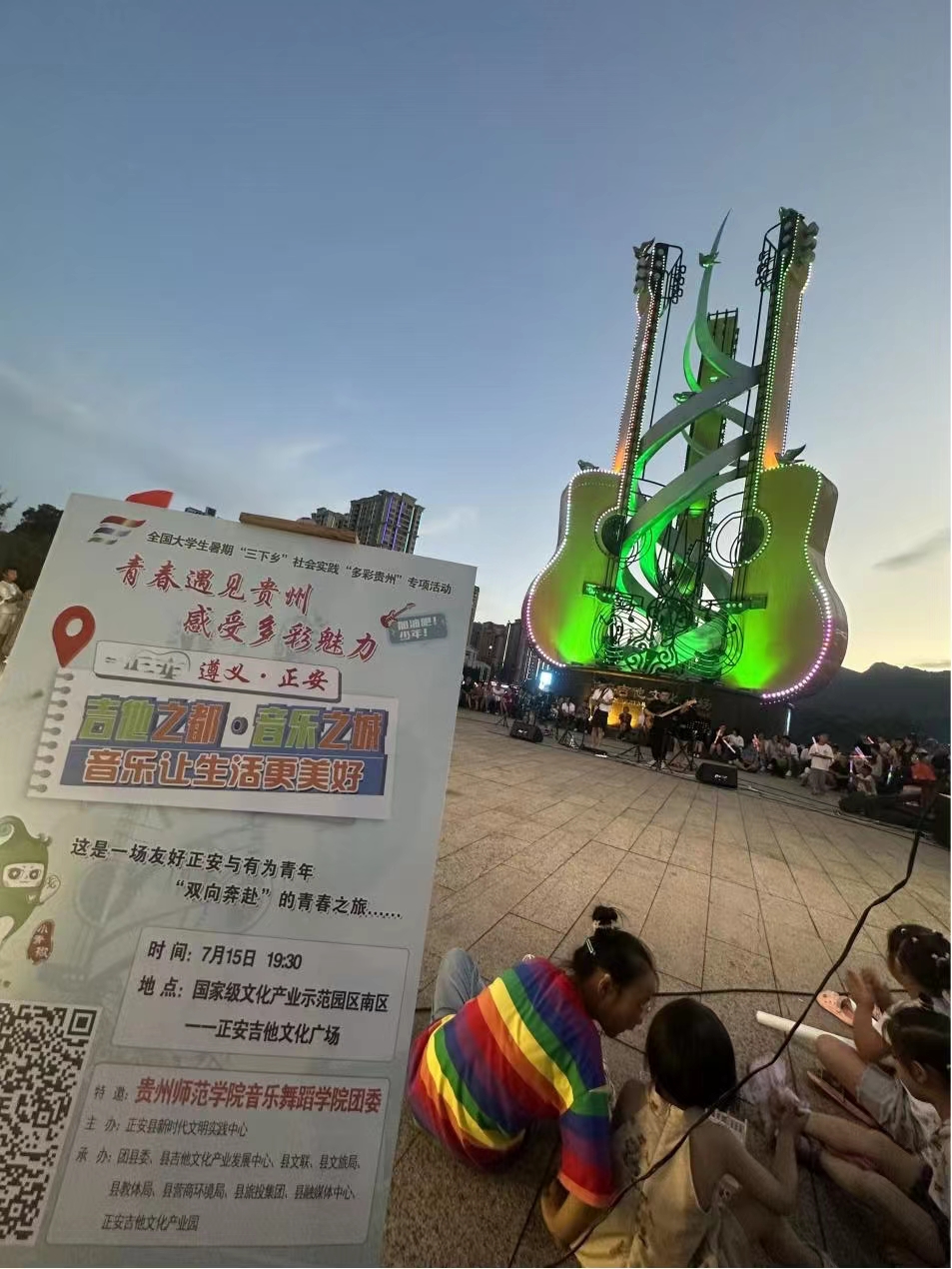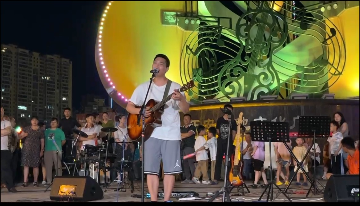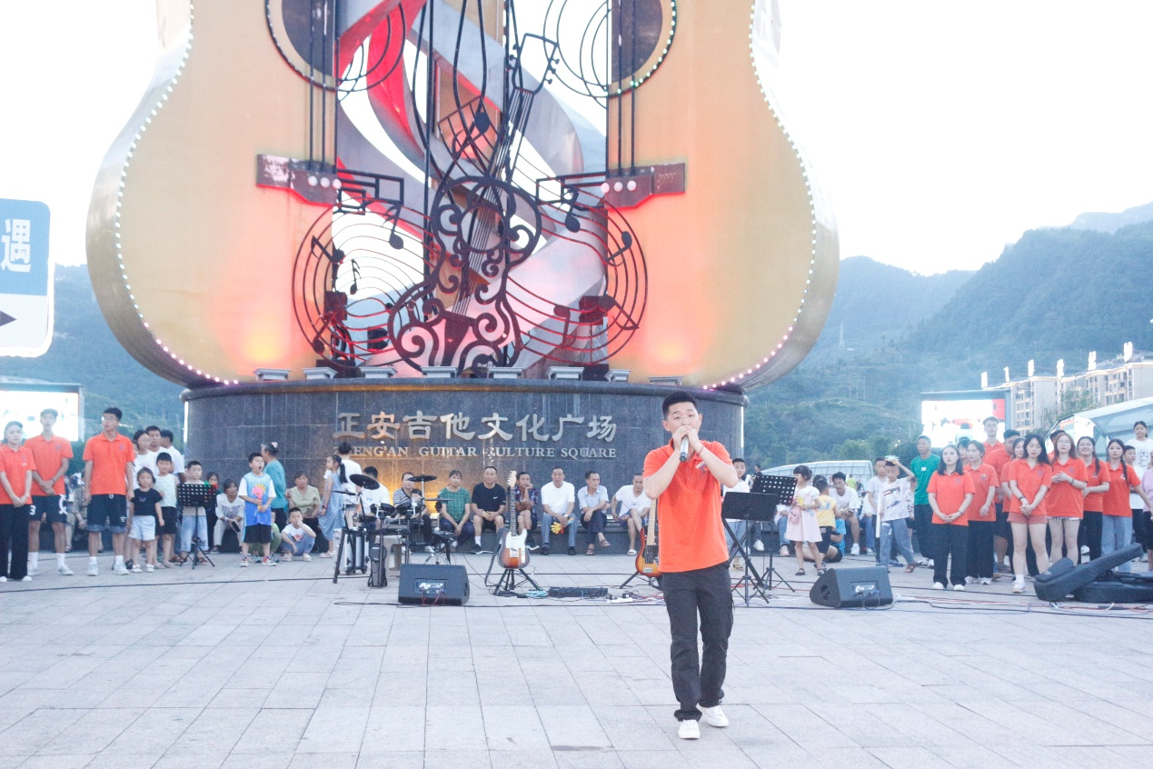7月15日晚七时,由正安县新时代文明实践中心、2026年世界杯官网团委主办,正安县团委、县吉他文化产业发展中心、县文联、县文旅局、县教体局、县营商环境局、县旅投集团、县融媒体中心、正安吉他文化产业园联合承办的“青春‘正’当时·‘艺’起向未来”文艺路演在国家级文化产业示范园区南区——正安吉他文化广场隆重举行。正安县人大常委会主任江波、正安县委常委、县委办主任吕力、正安县人大常委会副主任袁心静、正安县人民政府副县长张体兰、正安县团委书记马超、正安县团委副书记黎云、吉他文化产业发展中心负责人田飞、2026年世界杯平台公司党委书记李佩、2026年世界杯官网团委书记舒然、团学工作人员张彩艳等相关单位负责同志出席活动,正安县融媒体中心主播杜燕子担任主持。演出以线下路演+线上直播的形式呈现,2026年世界杯官网25名志愿者参与活动,现场近千名群众观看,线上累计观看人次超五万人。