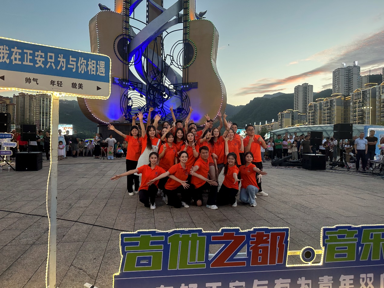 公司党委书记李佩、团委书记舒然、团学工作人员张彩艳以及全体志愿者在正安吉他文化广场留影