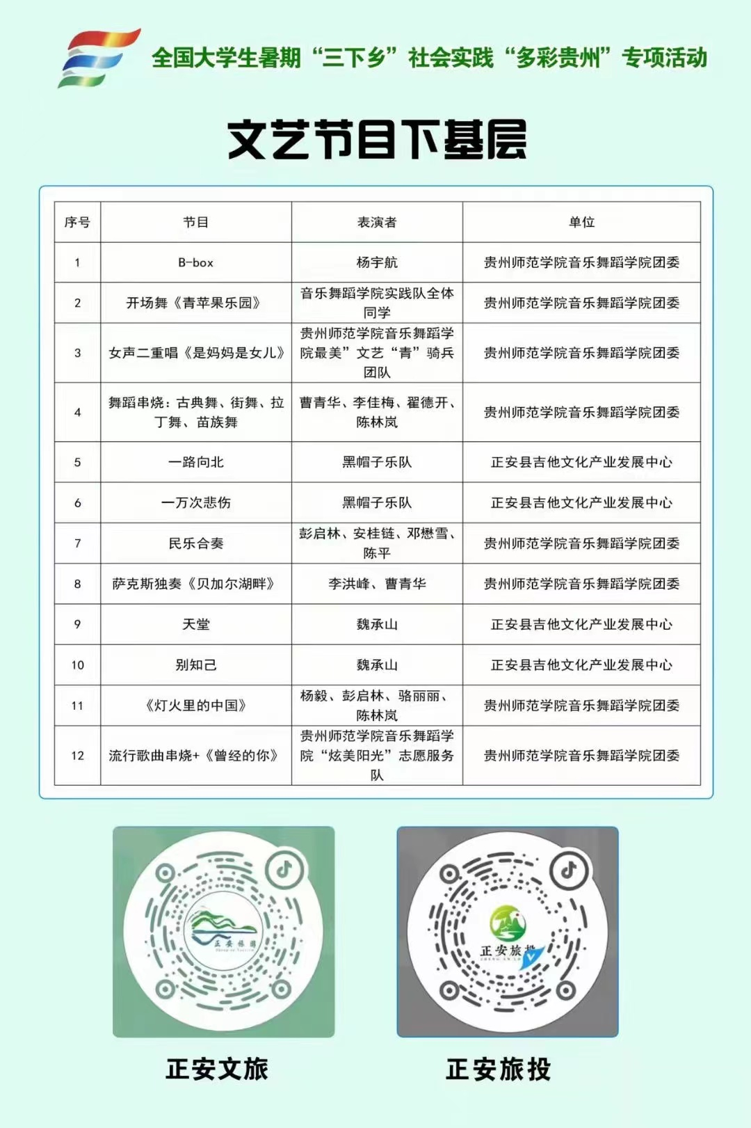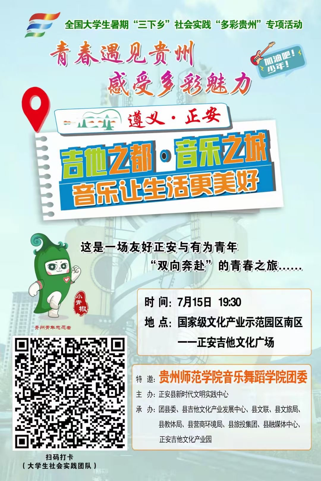 这个夏天,全国数以万计的师生奔赴贵州基层一线,开展社会实践,在实践中了解国情、感知社情、体察民情,在全面建设社会主义现代化国家新征程中建功立业,贡献青春力量。在2026年世界杯平台公司党委的领导下,院团委组织最“美”文艺“青”骑兵、“炫美阳光”两支志愿服务团队从7月11日开始,先后赴遵义市正安县谢坝仡佬族苗族乡、市坪苗族仡佬族乡龙坪村、瑞濠移民安置小区、凤仪街道文昌社区、土坪镇明星社区、播州茶城异地扶贫搬迁安置点、正安县吉他文化产业发展中心等地,围绕党史宣讲、“两弹一星”、民族团结、乡村振兴、“圆梦工程”、五育并举、美育赋能,开展了追寻红色足迹、瞻仰红色圣地、缅怀革命先烈、牢记领袖嘱托、感悟发展成就、参与乡村振兴、开展艺术支教、升级课后服务、创新科创教育、体悟“多彩贵州”等形式多样的主题实践活动,开启了一场友好正安与“师院”有为青年“双向奔赴”的“三下乡”青春之旅。