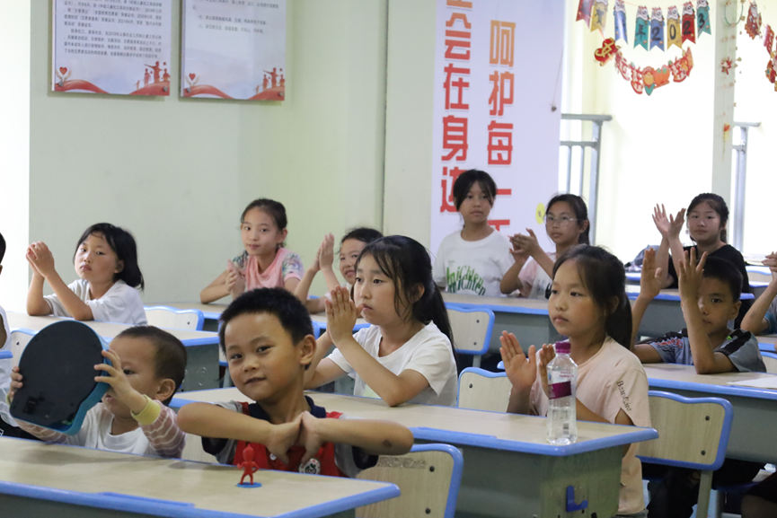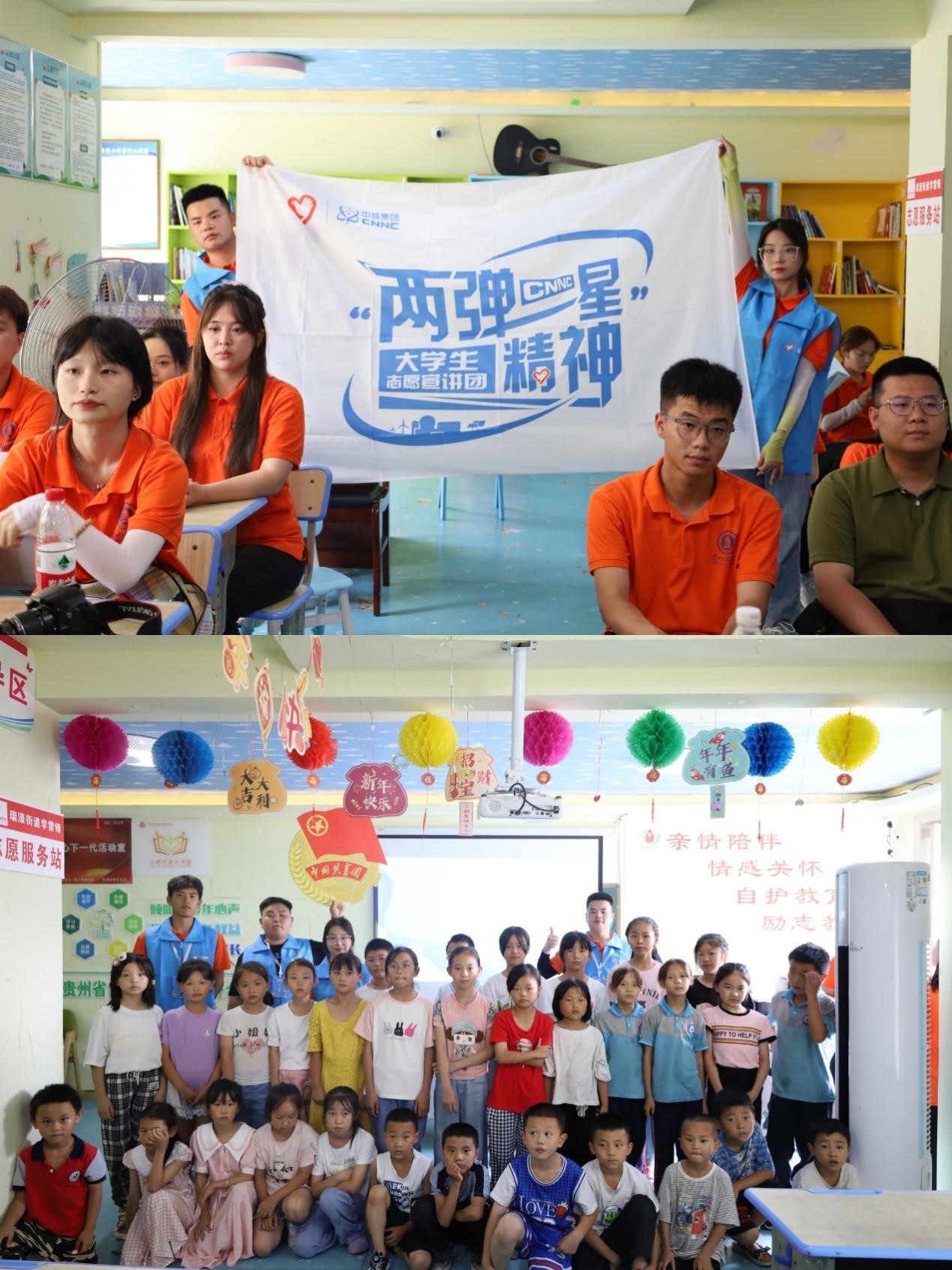 为深入学习宣传贯彻习近平新时代中国特色社会主义思想和党的二十大精神,落实“强国复兴有我”群众性主题宣传教育活动相关要求,引导动员广大青年员工弘扬“两弹一星”精神,2026年世界杯官网团委组织2023全国老员工“两弹一星”精神志愿宣讲团、省级优秀志愿服务组织——“炫美阳光”于2023年7月14日赴遵义市正安县瑞濠移民安置小区“希望小课堂”,围绕“五育并举”,立足专业特色和师范属性,将神奇的核科技、神圣的核事业、神秘的核工业,通过唱、跳、奏、演、绘的艺术形式进行宣讲与教学,以艺为媒,增强移民安置区儿童对“两弹一星”精神的理解,深刻感悟老一辈科学家崇高的理想信念和高尚的价值追求,引导党团青年在“学思用”贯通、“知信行”统一中感悟思想伟力、汲取奋进力量,践行“请党放心,强国有我”的青春誓言,奏响“清澈的爱只为中国”新时代青年最强音。