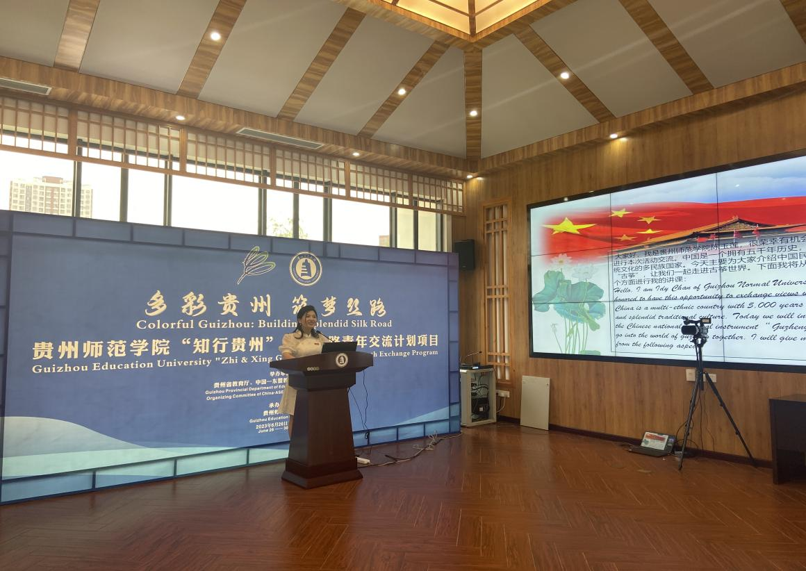 舒然以讲授融合项目展示的方式,带领海外朋友们共同探寻贵州少数民族音乐文化宝藏,倾听了久负盛名的苗族飞歌、蜚声国内外的侗族大歌以及风格特异的彝族酒礼歌,并就其民族在不同时期、不同地理环境中的音乐形态、风格特征进行了系统阐述和理论归纳。陈玉莲选取了立足中国传统文化,体现贵州地域和少数民族特色、不同类型和题材的古筝曲目为大家进行逐一解读和技法讲解。