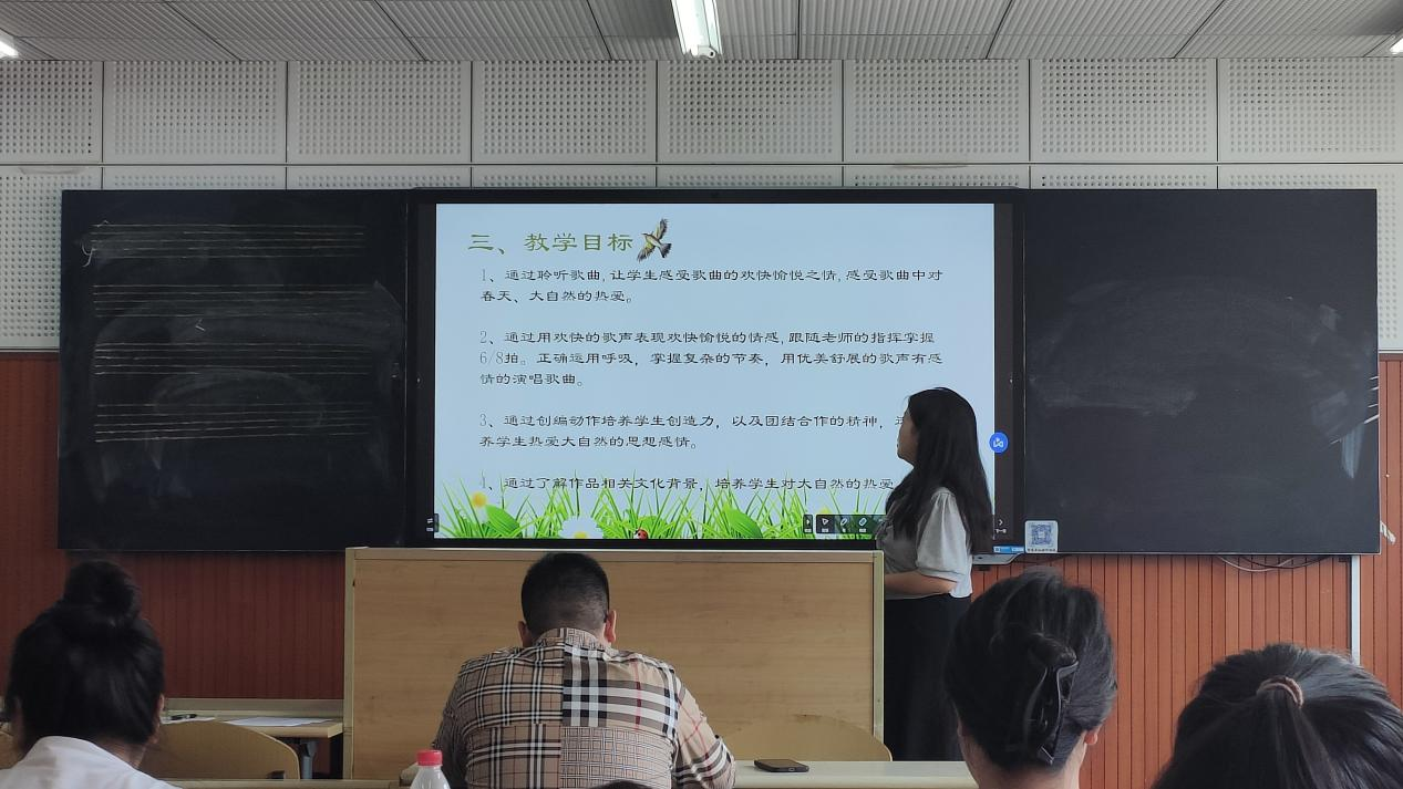 本次说课实践活动,既是赛场,也是教学基本功“秀场”,更是同学之间互相学习的好平台。在每一个说课活动赛场,同学们围绕自选的音乐教材不同课题,从说教材、说教学目标、说教学重难点、说教法学法、说教学过程、说板书设计等几个方面进行5分钟左右的说课。从同学们的整体表现来看,即将步入实习阶段的同学们普遍准备充分,在讲台上的仪态落落大方,语言表达流畅,思路清晰。通过精炼的语言表达,同学们能够把课堂所学到的教学理念、教学方法与实践操作较好地结合起来,展示了合格音乐师范生应该具备的专业素养,他们的说课表现普遍受到各教研室评委老师好评。