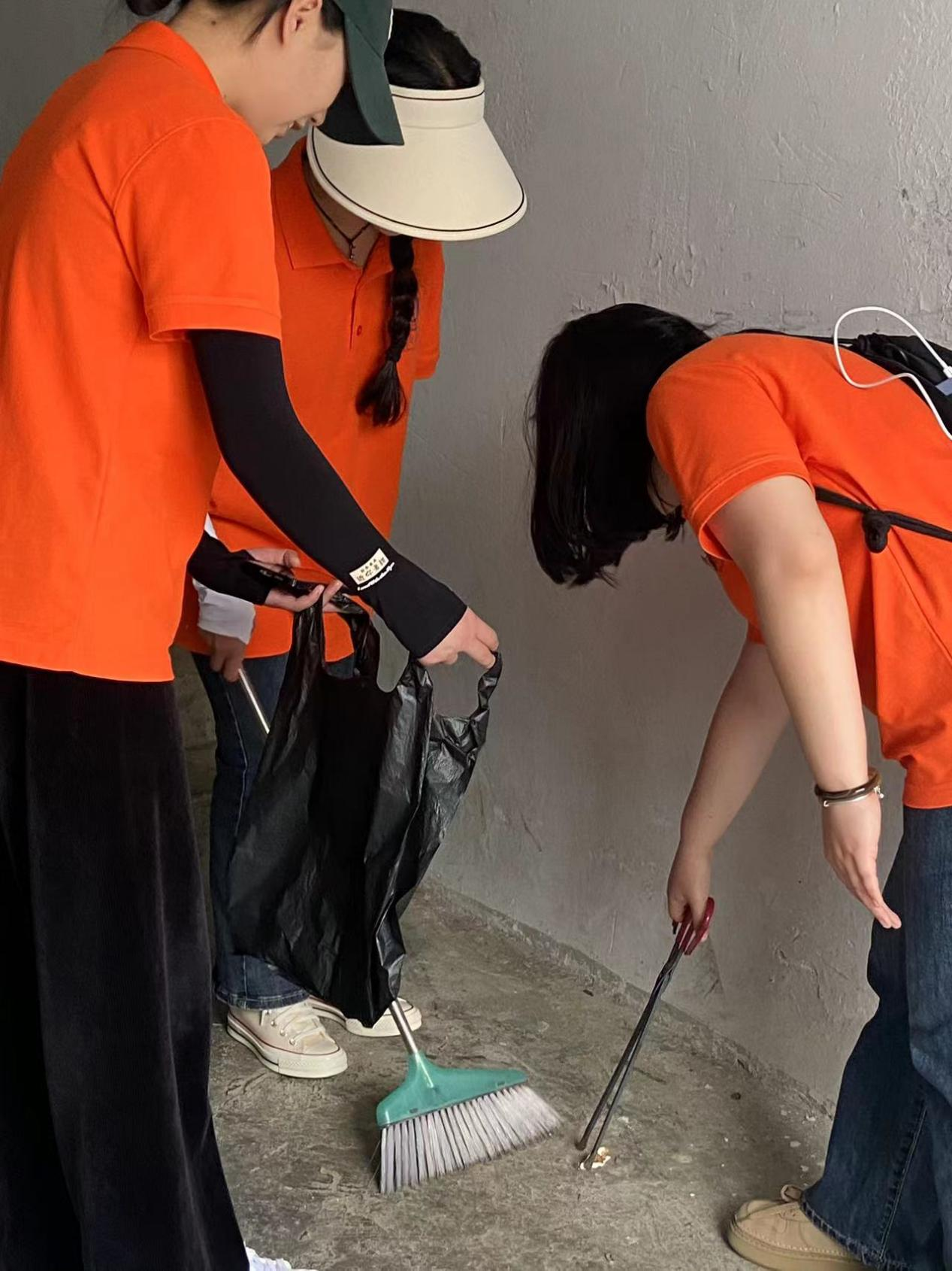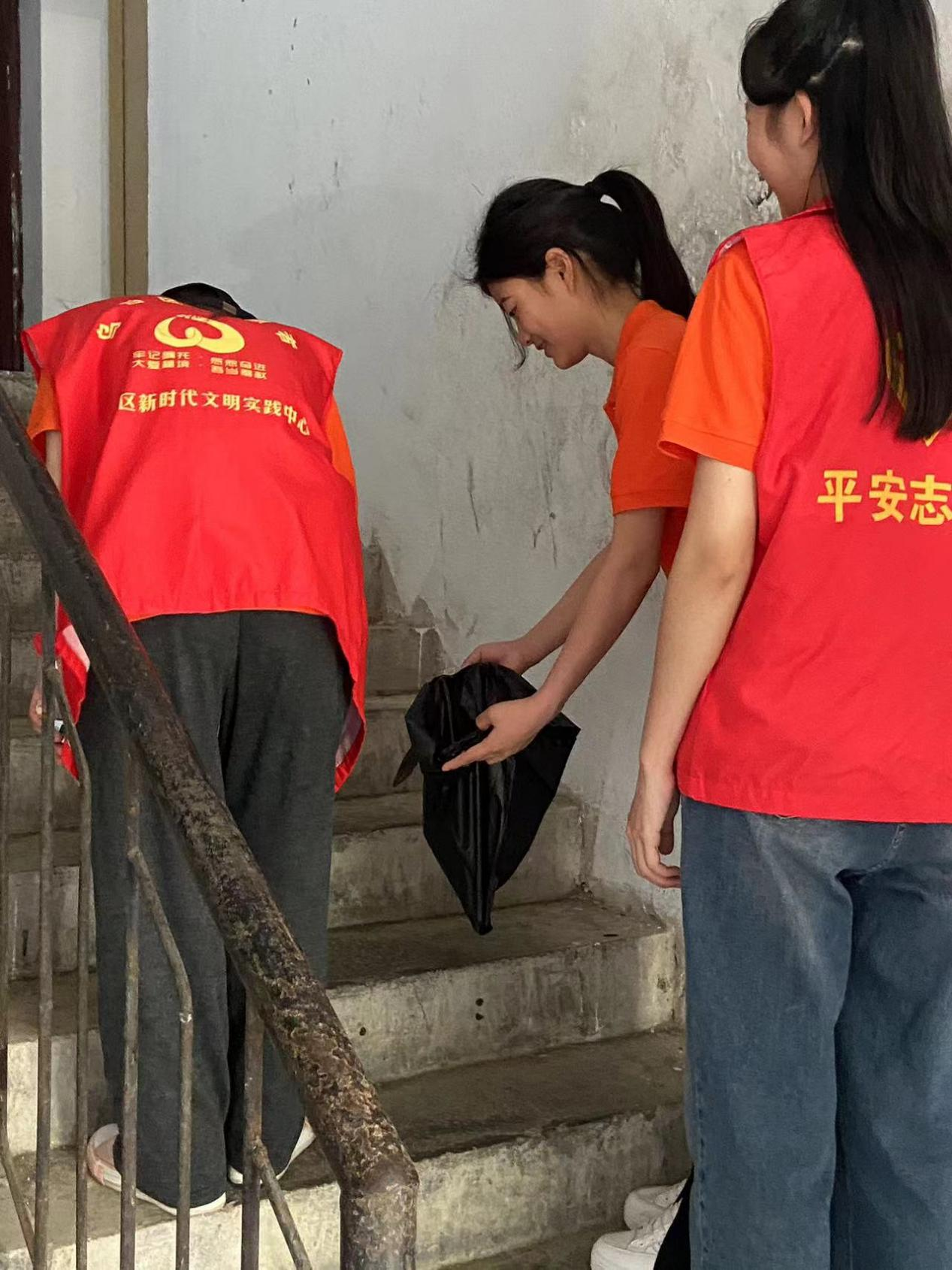 志愿者们清理楼道垃圾