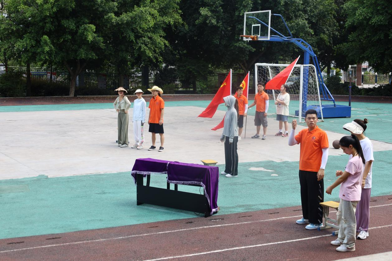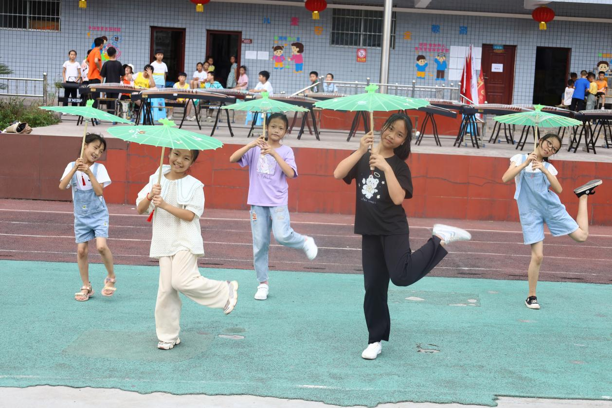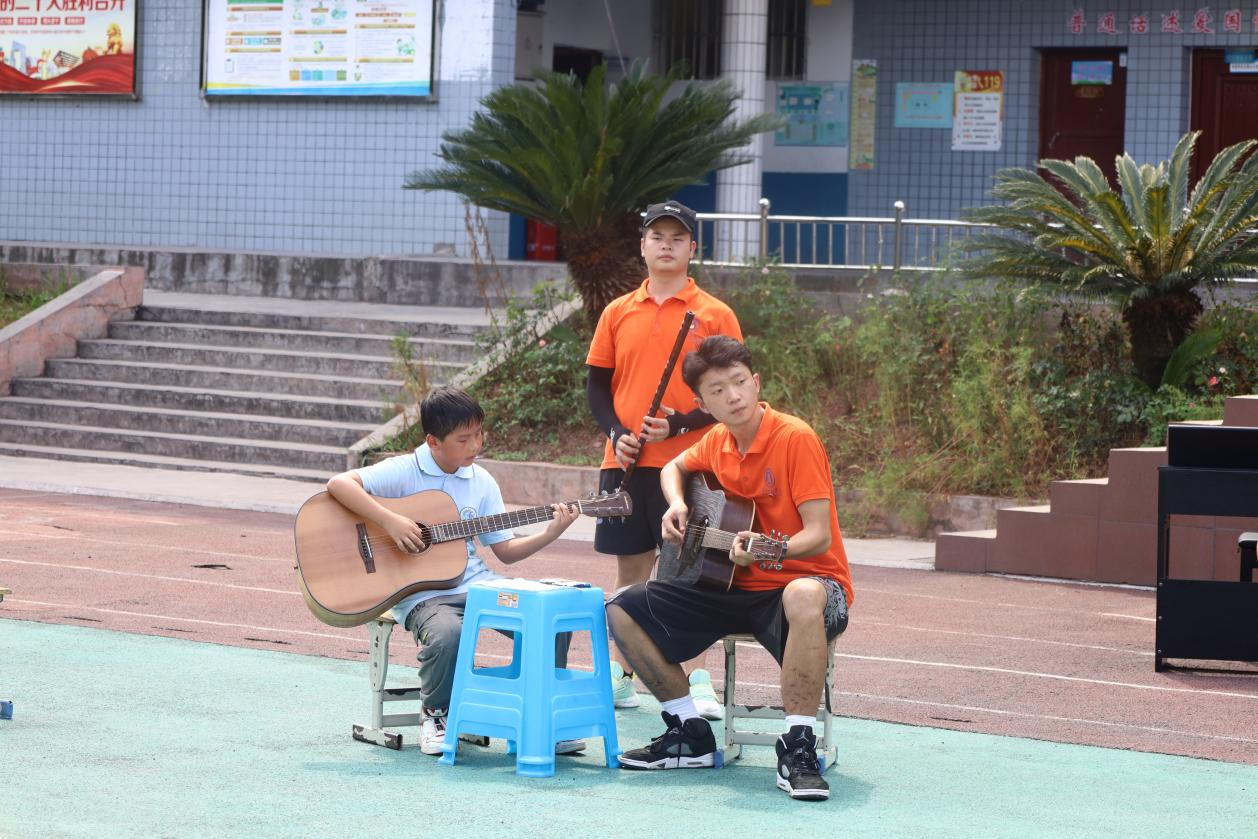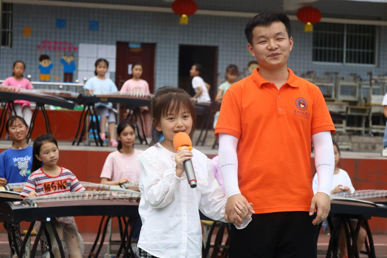 团中央“七彩假期”志愿服务示范团队、贵州师范公司党史学习教育国家级团队“炫美阳光”结对帮扶习水县二郎镇中心小学开展暑期“三下乡”活动已渐入尾声,凝聚师生心血、呈现教学成果的汇报演出指日可待。7月24日的实践活动中,晚会节目联排紧锣密鼓的进行着,炎炎夏日,骄阳似火,椅席炙手,但全体演职人员均全情投入、心无旁贷的重复着一个又一个动作、一遍又一遍表演,无一人抱怨、无一人退缩。当被问到最大的收获时,参与演出的二郎镇小员工们积极举手,踊跃发言。童声合唱《萱草花》节目的领唱钟语晨说:“我第一次知道唱歌的专业名词叫声乐,声乐并不是简单的‘想唱就唱’,田玉婷姐姐教会了我科学的发声方法,还叮嘱我保护声带、合理用嗓。”民乐合奏《映山红》节目的丁欣悦说:“我第一次见到那么多的乐器同时出现在教室,也是第一次接触琵琶,我很喜欢‘她’的声音,抱上琵琶的那一刻我感到自己是最自信的!”少儿古典舞蹈《杏花雨纷纷》节目的王瑞卿说:“原来舞蹈还分古典舞、现代舞和民族舞,将来有机会我要全部学会,成为一名全能舞者!”