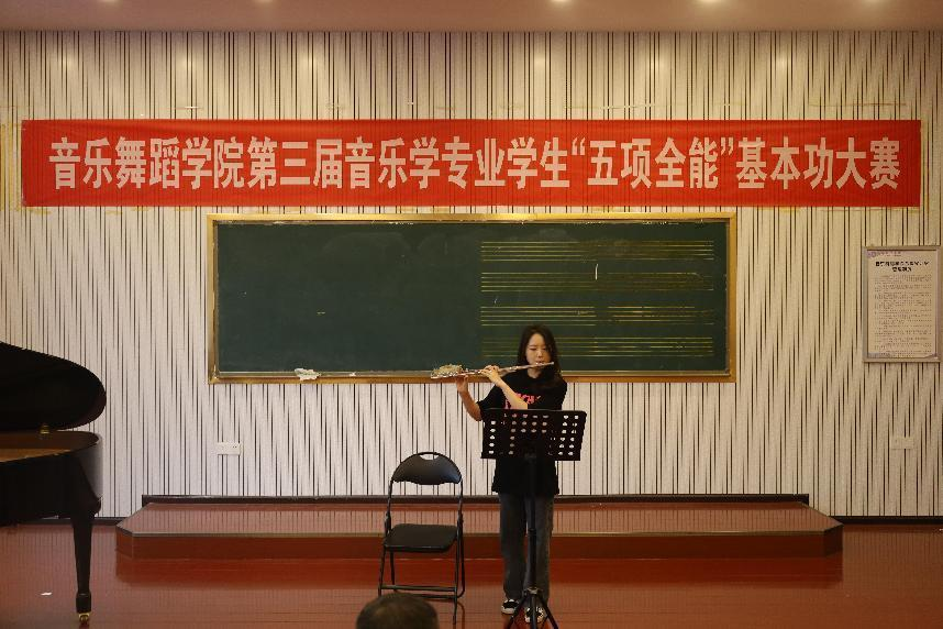 合唱指挥,参赛选手自备曲目,每一合唱小组都有序地进行赛前排练,赛场指挥。伴随着钢琴声,每一队参赛选手从容自若,他们挥动的双手展示了他们日积月累的训练成果,也将他们对于音乐的喜爱展现给了他们所热爱的舞台;器乐独奏中,每位参赛选手倾情演奏:有萨克斯带来的细腻委婉、琵琶带来的柔和与铿锵、管弦乐带来的悠扬与婉转等,无论是哪一类乐器,都各有韵味;舞蹈比赛中,选手们散发着青春的活力,即使他们是音乐学专业的员工,但他们曼妙的舞姿也让观众看到舞蹈带来的魅力,他们身体的每一次律动都让人感受到音乐师范生的综合能力。