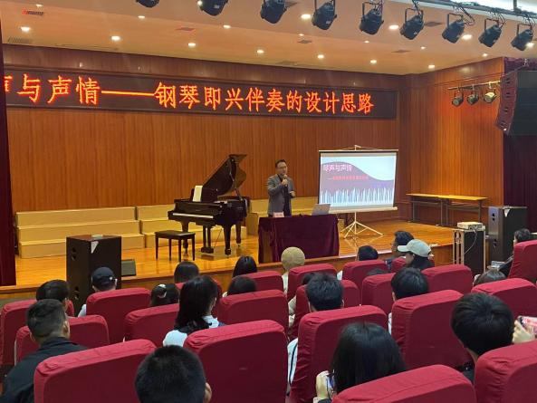 张老师首先对钢琴伴奏的理念进行讲解,并提出弹奏前要进行整体设计。随后以《渔光曲》为例子展开实践,包括了歌曲的基础和声设计、音型织体设计和演唱设计。张老师在实践中对上述的设计理念进行了一一讲解,并对不同的景物、人物和情感所需不同的织体设计进行描绘,使钢琴伴奏更加贴合歌曲本身的情感需要,并将演唱和伴奏更加谐和的融合在一起。