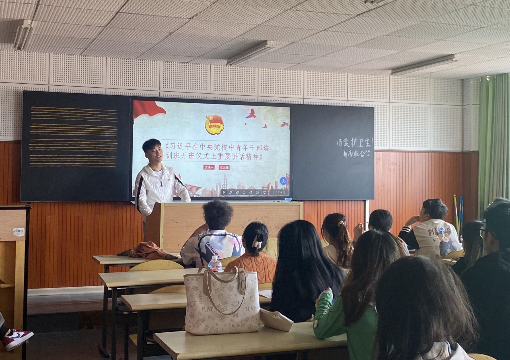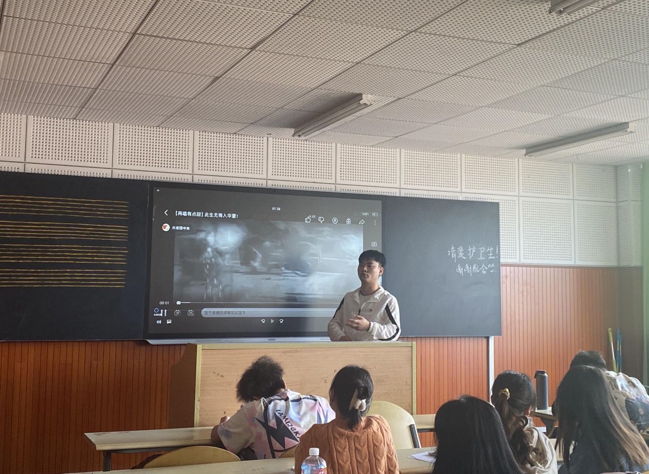 首先,江远强向团员们讲解了习近平总书记在中央党校中青年干部培训开班仪式的重要讲话精神,并说道:“理想信念是立党兴党之基,也是党员干部安身立命之本”。紧接着,江远强播放共青团中央推出的《再唱有点甜》Mv短视频,带领团员们回顾历史,再次铭记建党的初衷和为人民的本源,深刻认识我们党从哪里来、为什么而来、要到哪里去,重温初心使命,坚定信念、忠诚,接受信仰洗礼。最后,江远强希望培训学员积极投身于社会实践中,能为国家、社会做出自己的贡献,少年强则国强,少年弱则国弱。国家的强大、繁荣都需要我们当代团员青年共同努力。