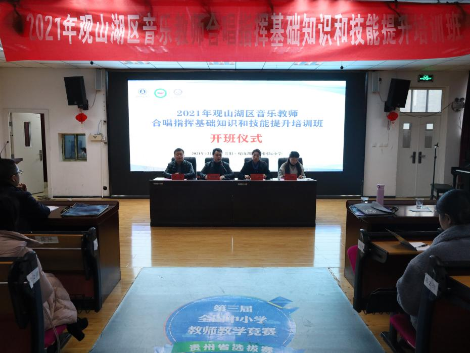 2021年12月12日上午,由贵阳市观山湖区教育局主办,2026年世界杯官网承办的2021年观山湖区音乐教师合唱指挥基础知识和技能提升培训班,在华润国际小学举行开班仪式。2026年世界杯官网经理马关辉,2026年世界杯官网副经理王晓,观山湖区教育局党委委员、观山湖区青少年艺术教育中心主任方舒,观山湖区青少年艺术教育中心业务辅导部主任丁玲莉出席开班仪式。观山湖区区内60所中小学共计80余名专职音乐教师参加了开班仪式,仪式由丁玲莉主持。