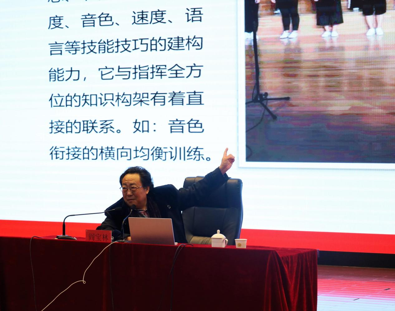 讲座上,阎宝林教授从理论出发,首先向大家解释了“合唱指挥知识构架的二元思维”。他提出,教师要提升音乐文化素养,要将各个时期的风格搭配到指挥中去;同时,他从训练能力和排演能力两方面强调了,指挥教师在排演的过程中要启发学员的创造力,给予学员发挥想象的空间,编排他们自己理想中的美好画面。