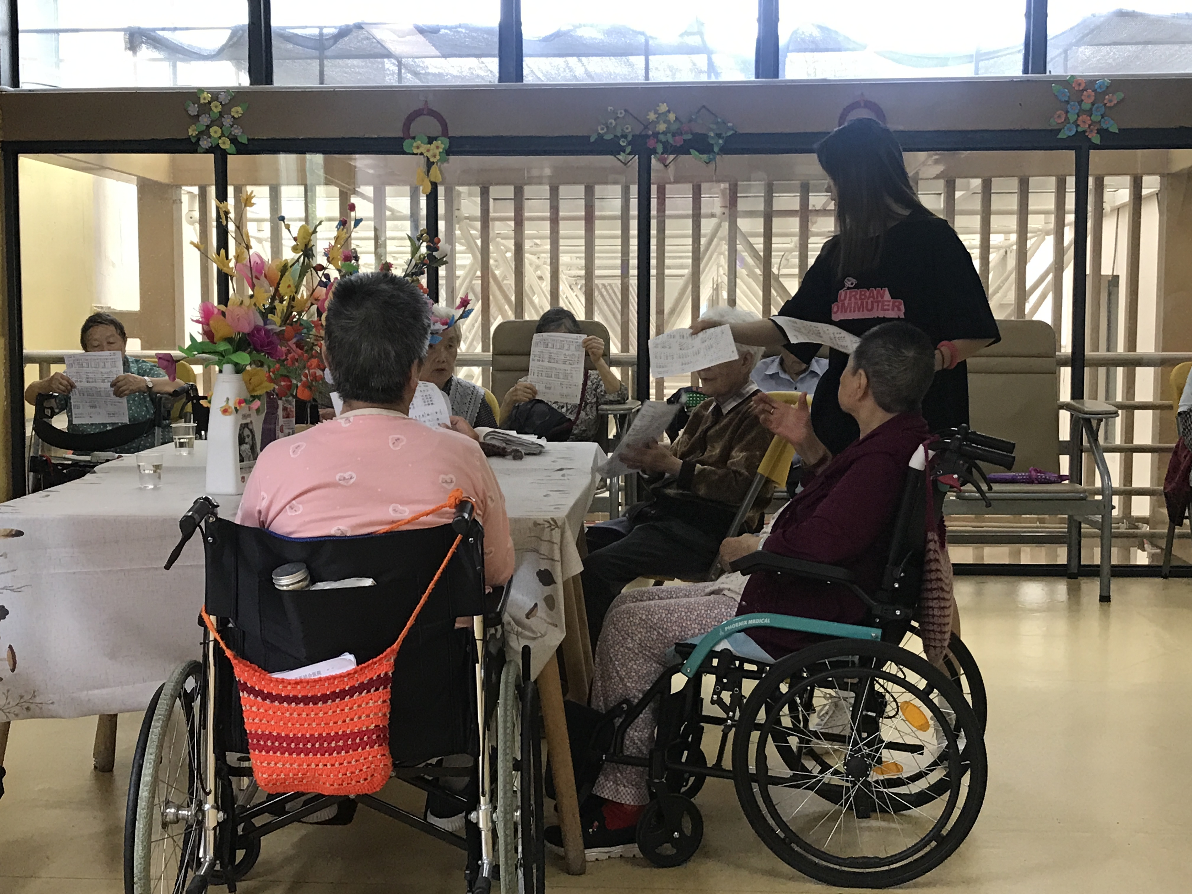随后进行了红歌传唱教学。在了解了老人们所喜爱的歌曲的基础上,最终选择了内容带有叙事性,风格轻松活泼的《真是乐死人》进行教学。由代瑞敏、陈欢两位同学进行歌曲教授。起初老人只是静静坐着听我们演唱,仿佛只是一次简单的慰问演出。在各位小伙伴的引导下老人们开始逐渐参与进来,用手拍打着节奏,兴趣显然提高了很多。就这样在我们唱一句,他们唱一句的传唱中大家熟络了起来,沉醉在了音乐里的氛围。