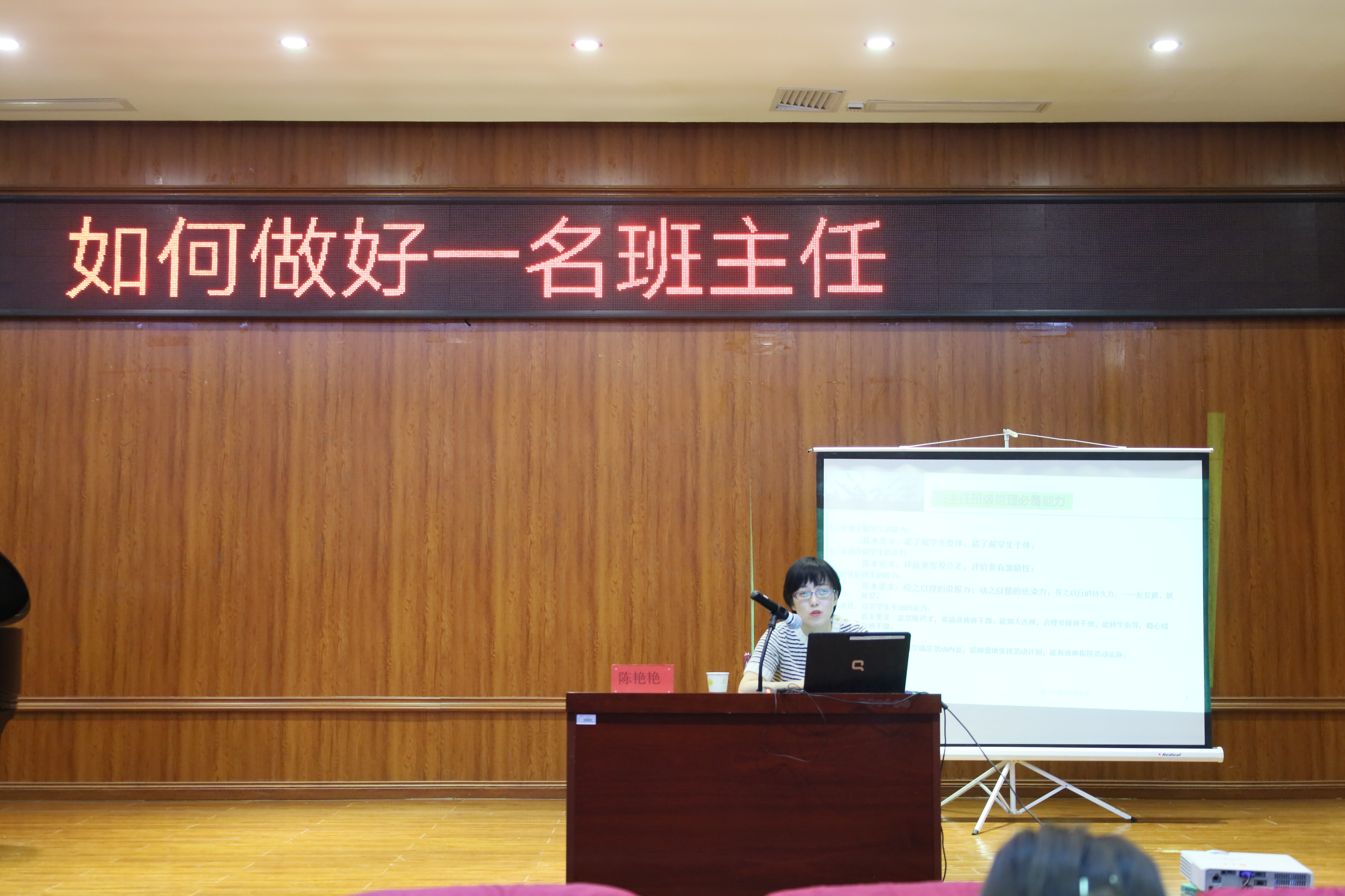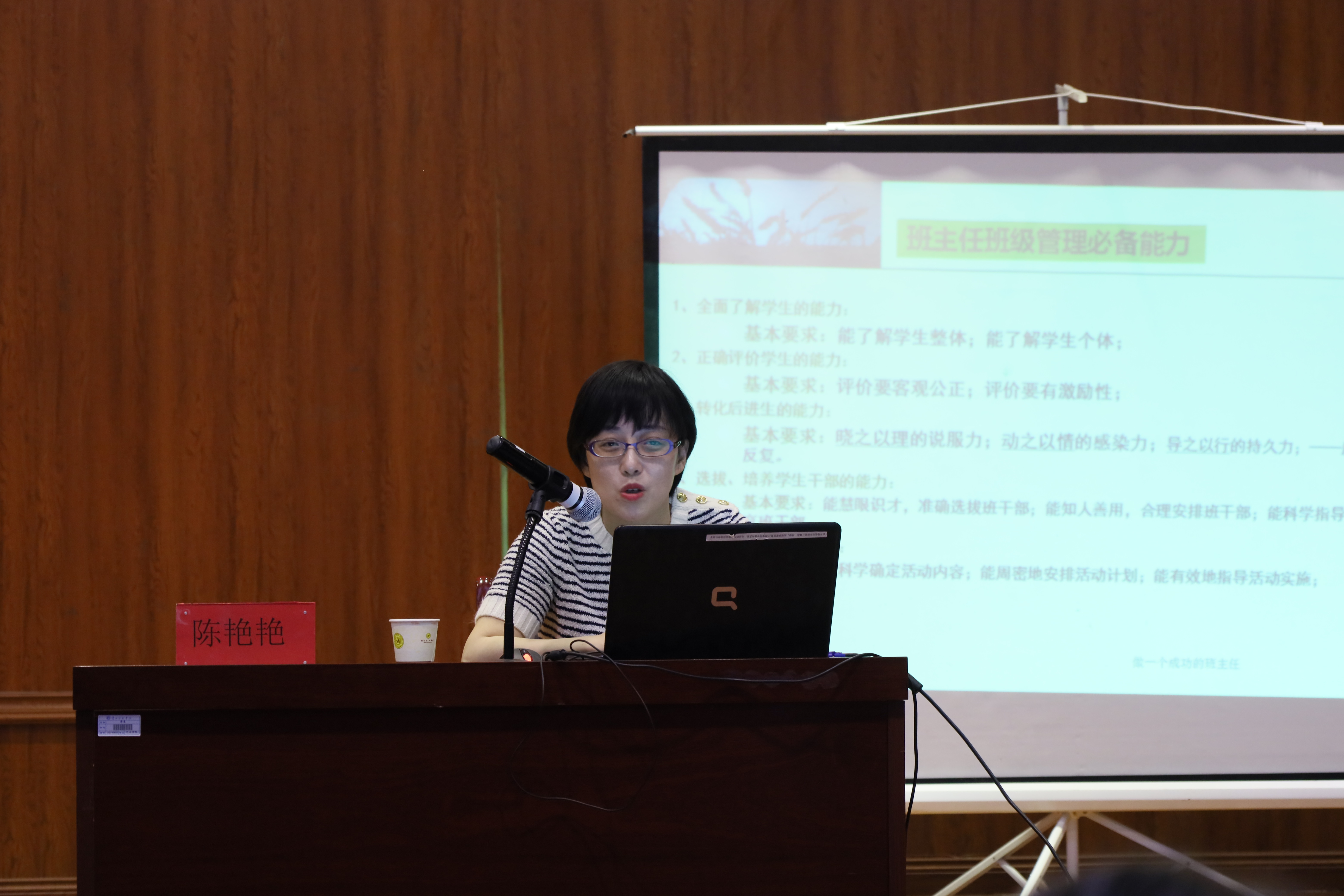 在讲座过程中,陈艳艳老师把“如何做好一名班主任”分为三个板块讲解:认识班主任工作、班级建设、班主任应处理好的几个人际关系。并向同学们展现了作为一名优秀的班主任所应具备的哪些能力。其中重点讲述了“班级建设”,一个优秀的班级肯定离不开一整套合理有效的班级管理制度,班级管理也是班级能够正常运作的得力保障。老师用自己的教学经验,生动形象地向同学们讲述了想要成为一名优秀的班主任应具备更为全面的素质素养。