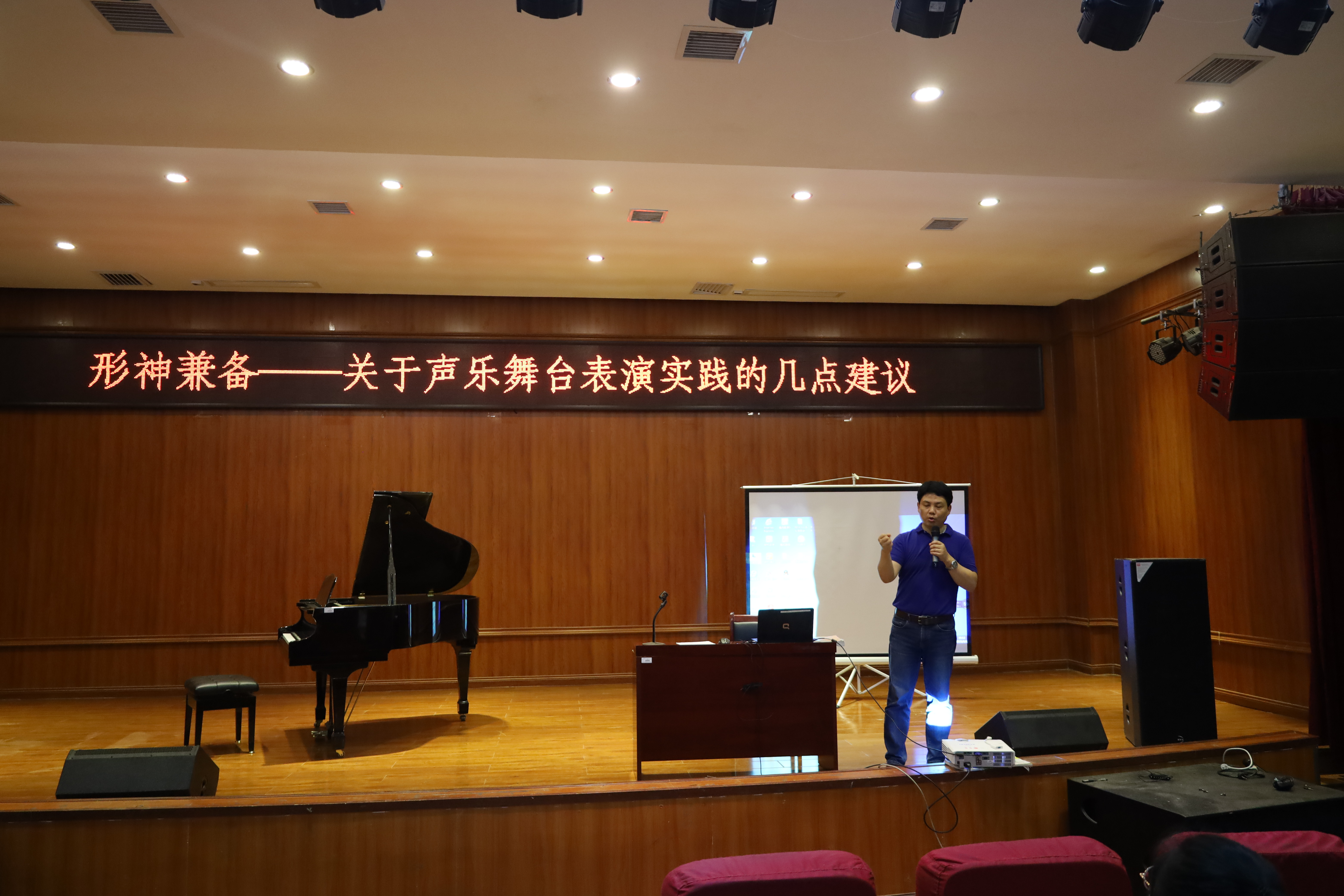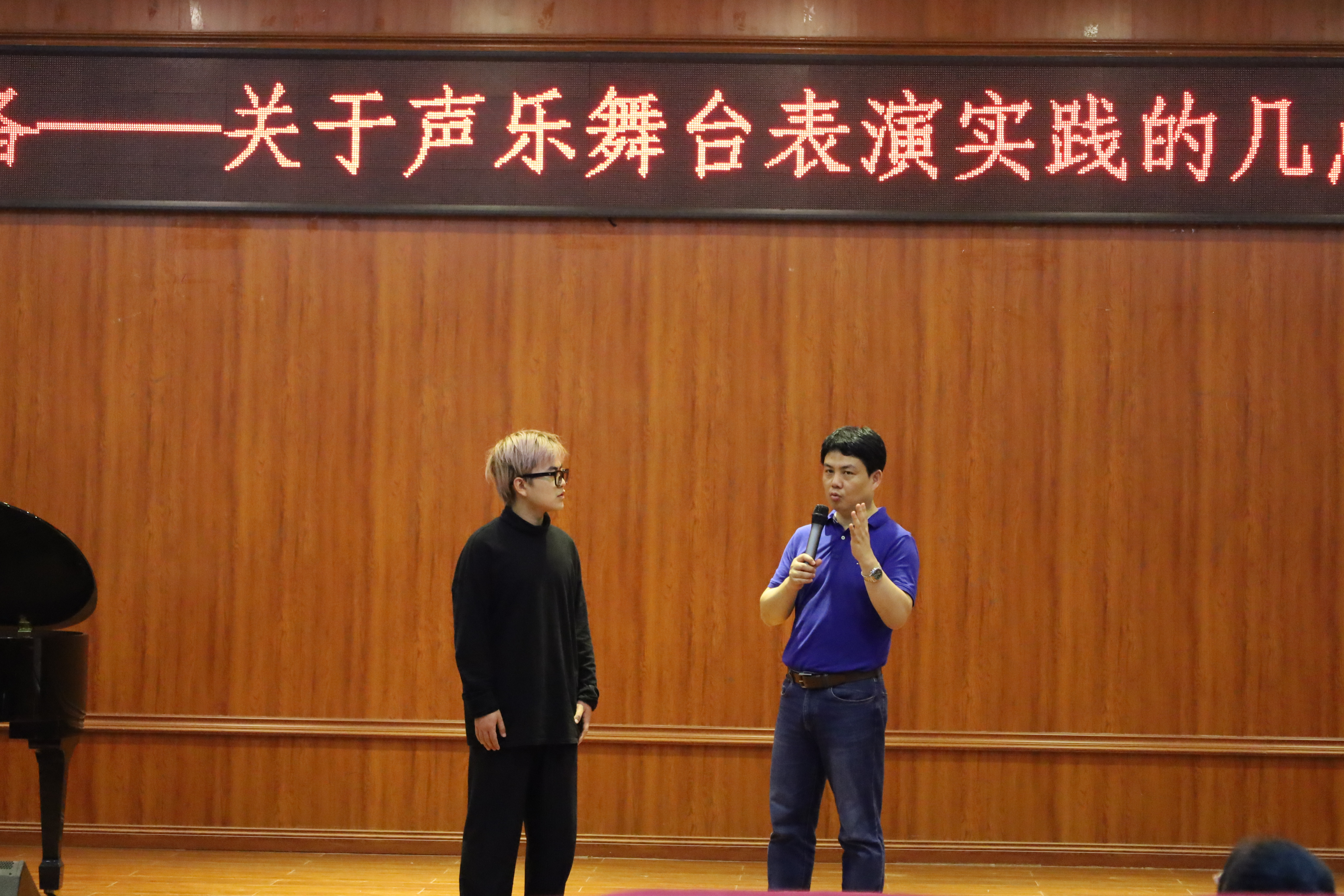 首先,刘临洪就“声乐舞台表演实践”提出的台风、演唱、上下台等问题,其次让几位同学上台实践,然后让下面的同学提出问题,大家对第一位同学提出的问题为手上动作太随意、眼神恍惚、表情管理不到位,第二位为动作太拘谨、上台略显匆忙,第三位为上台随意、鞠躬随意、肢体过于拘谨,其余几位也是相似问题。最后刘临洪对这些问题提出了解决方案,同时也让这几位同学依次上台解决问题。