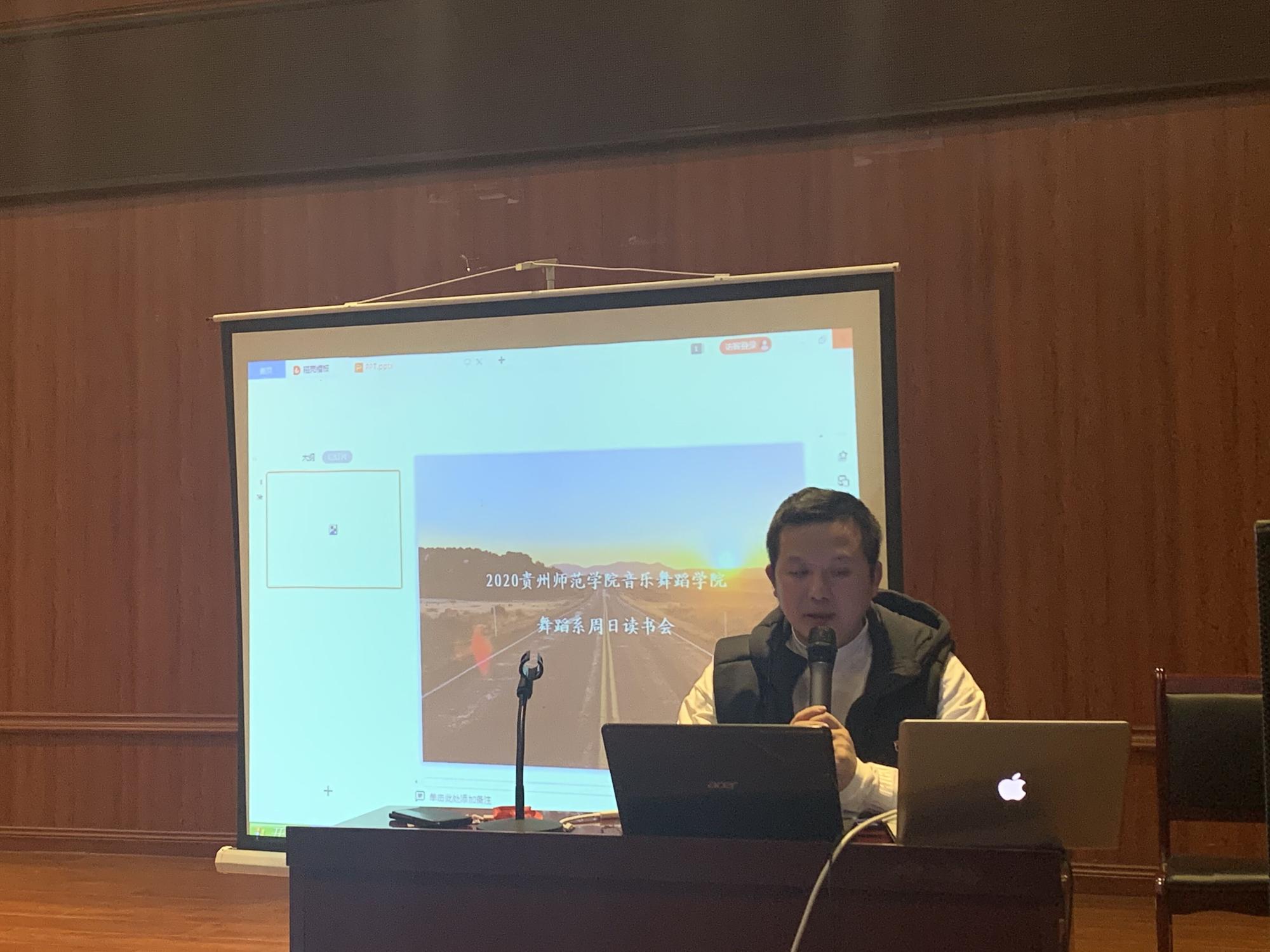 首先,肖伟讲解了读书交流会的总体设想和本次主题“文舞相融,为人师表”,期望师范生的同学们能够多方面发展,在今后从事舞蹈工作或其它行业,都能继续坚持读书的好习惯。舞蹈系开展这样一个读书交流会活动的目的是为提高员工综合素质,让同学们学会怎样读书,读什么书。将自己在书中的体会相互分享,相互讨论,相互进步。作为一个当代老员工,学习是我们的首要任务,相信这样一个读书交流会的开展会给舞蹈系的同学们带来不一样的老员工活及体验。
