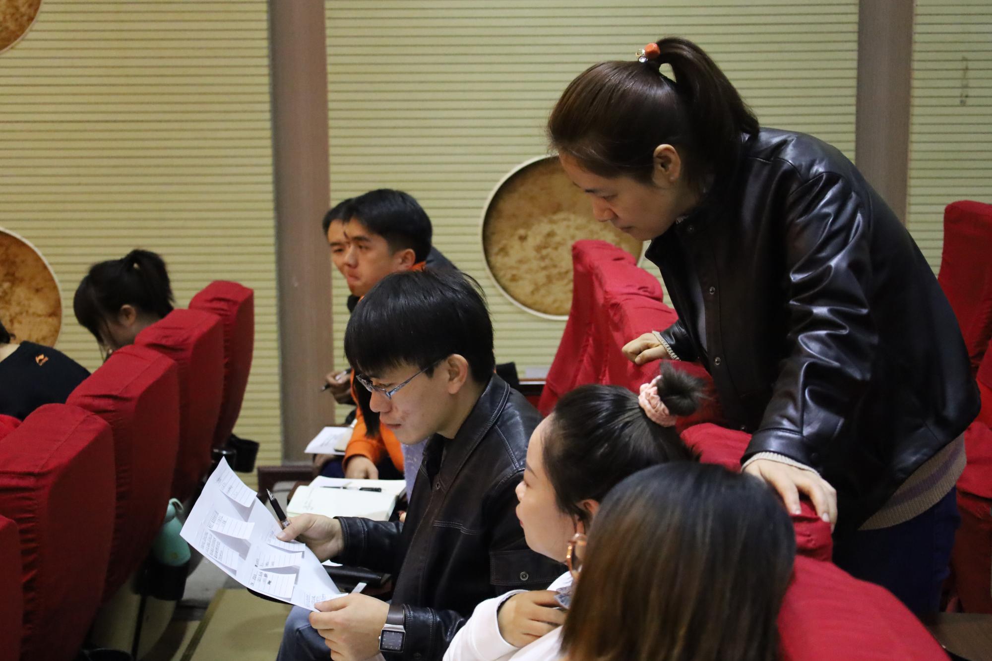 本次授课以游戏形式进行,首先把64名学员分组并进行汇谈,汇谈开始前,每名学员在便签纸上写一位人民满意的好老师,并且注明三个特征。随后由每组组长进行统计并将结果汇总给史恒老师,紧接着由史恒老师将特点进行总结,并且通过在纸上画出“人民满意的好老师画像”,再由各组小组长上台介绍。最后,史恒老师提出问题“如何成为一名人民满意的好老师”并进行解答,且强调了除加强学习、提升自身素质、爱岗敬业、尽职尽责等一系列基本条件外,还要以员工为主体,与时俱进,不断探索新的途径方法。