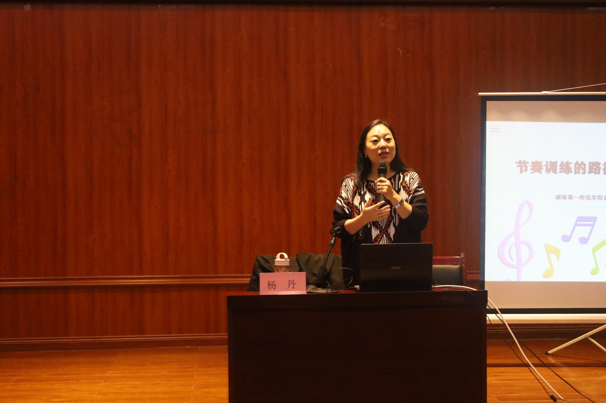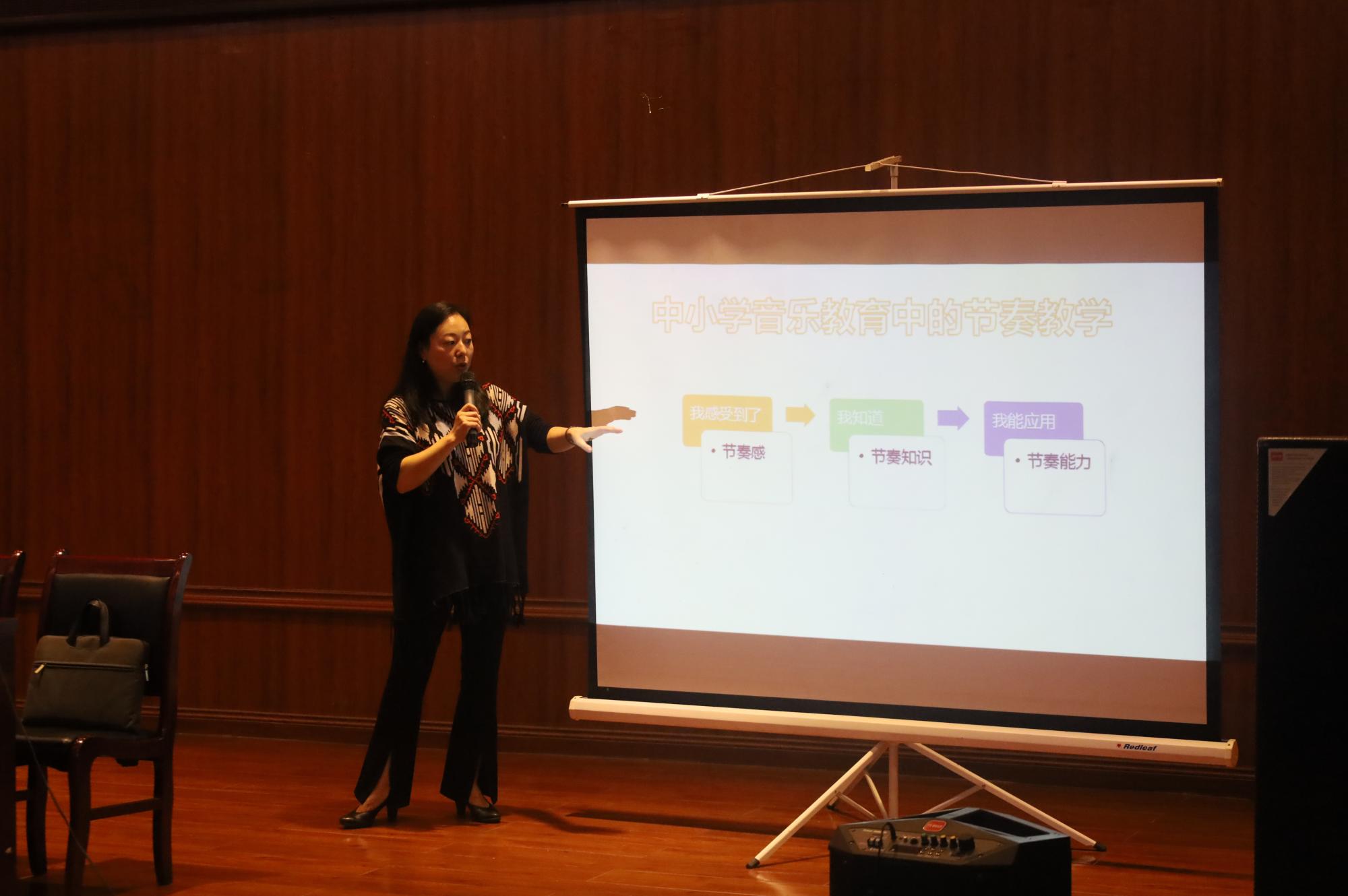 首先,杨丹教授给大家讲解了音乐的灵活性,音乐教育者要秉承音乐与生活相结合的理念从而把音乐更好的传递下去。节奏与生活息息相关。教师一方面可以通过游戏等活动来进行节奏训练;另一方面可以为员工提供一些生活中常见的打击乐器来感受节奏性。其次,运用语言教学法也能让员工们更好的提高节奏感,教师要运用语言中的节奏攻克音乐学习中的节奏难点。接着,杨丹教授对节奏提出几个相关问题:在节奏教学中有什么困惑?在你的节奏教学中常用的方法?杨丹老师以实践性的方法让学员们上台自行感受从而解决困惑,让学员们更深刻的体会到节奏与生活的一体性。