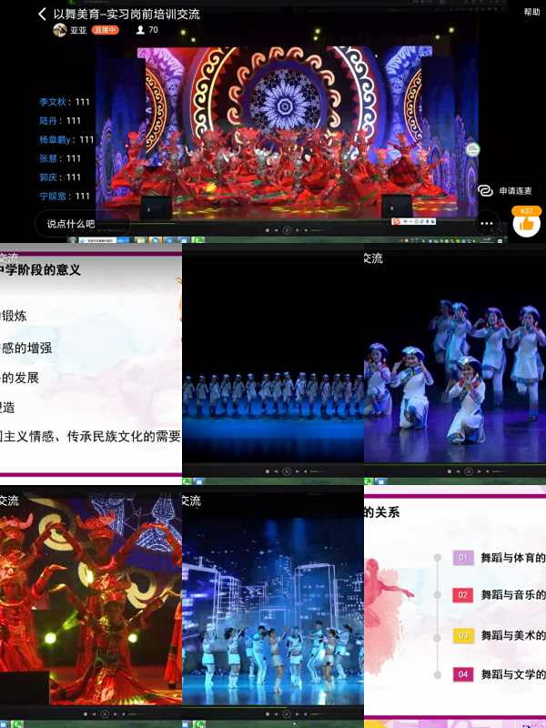 罗老师首先向员工简单的介绍了舞蹈教师在中学现阶段的就业形势,以及未来舞蹈教师行业的大概情况。罗老师根据自己多年的教学经验给大家分享了自己教学感悟,她提出美育在中学课堂的重要性,并且从素质教育美育的需要、中员工的心理特点、当前中学舞蹈课的模式、与其他学科的关系、舞蹈教学在中学阶段的意义、中学舞蹈教学的有效方式这六个方面同学们讲解舞蹈美育与中员工素质教育发展的关系。从美育的角度出发,以素质教育实践为主要目的,充分的发挥舞蹈教师这也职业的重要性。最后罗老师给员工们分享了贵阳市第七中学近年来的舞蹈学科发展成果,让员工们对未来的就业更加的充满期待。
