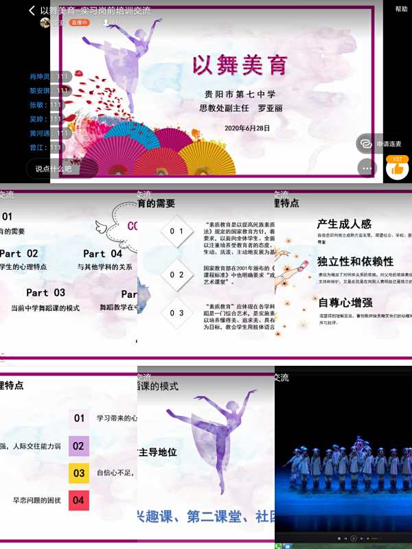 2020年6月28日,贵阳市第七中学思教处副主任罗亚丽受邀为公司即将实习的2017级舞蹈系员工举办实习岗前培训讲座,本次讲座利用互联网平台,采取线上直播的形式的进行。