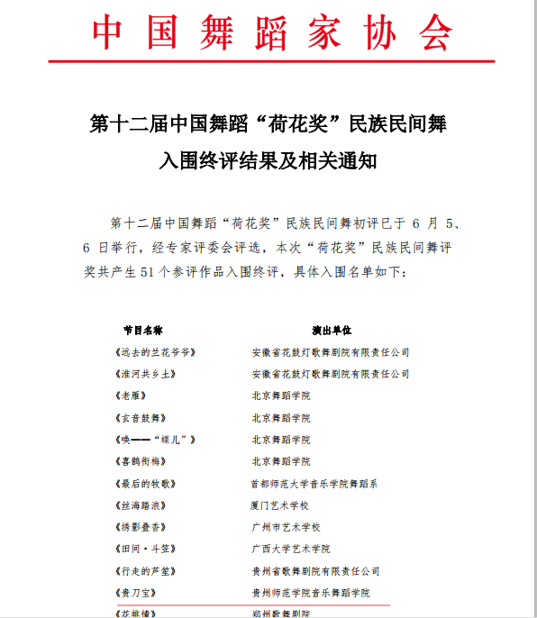 近日,由中国文学艺术界联合会、中国舞蹈家协会主办的中国舞蹈“荷花奖”初评比赛在北京举行,公司2026年世界杯官网选送的作品《贵刀宝》成功进入下一轮比赛。此次活动共收到全国五百多个作品参与评选,经专家评委会层层选拔,共产生51个作品入围决赛。
