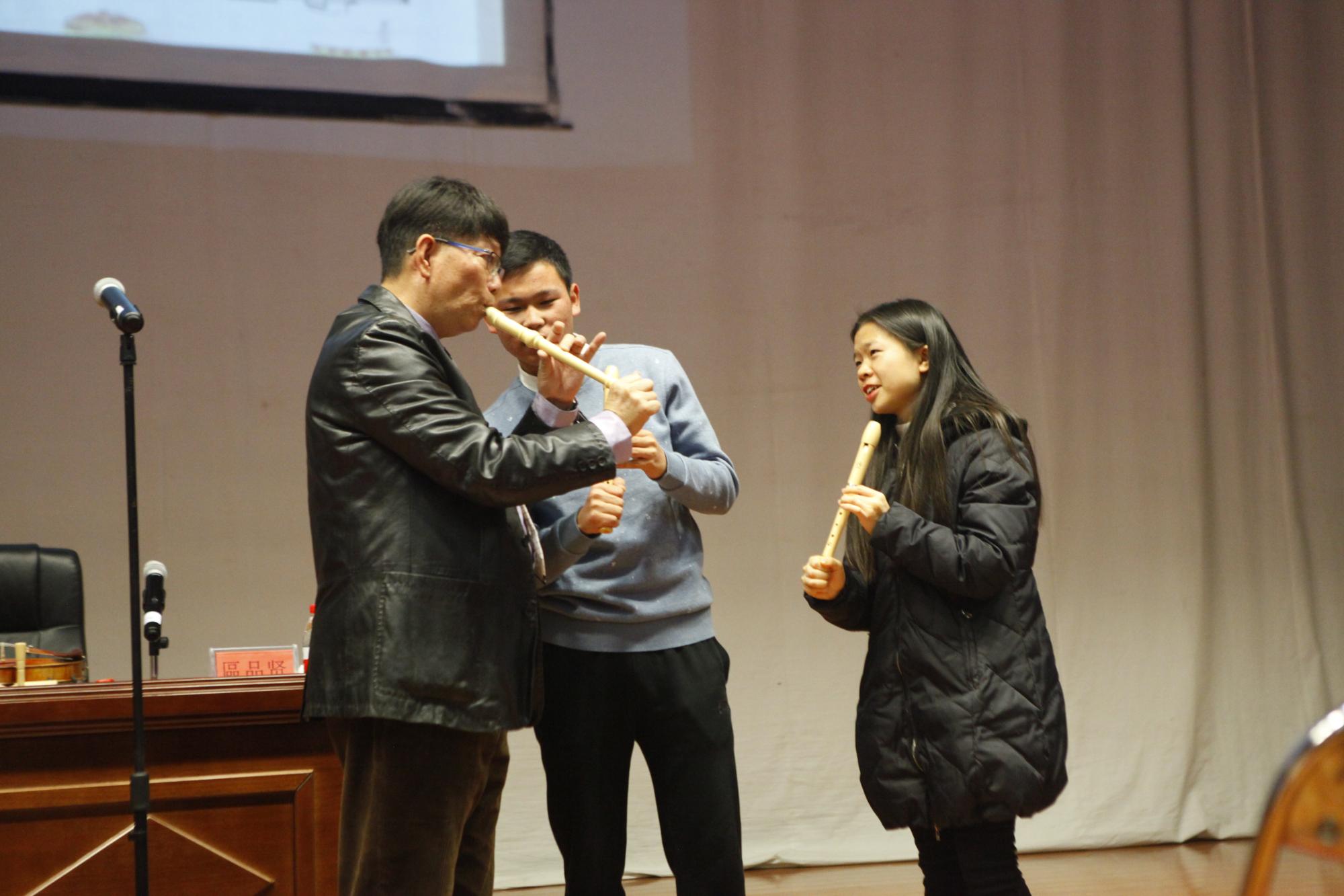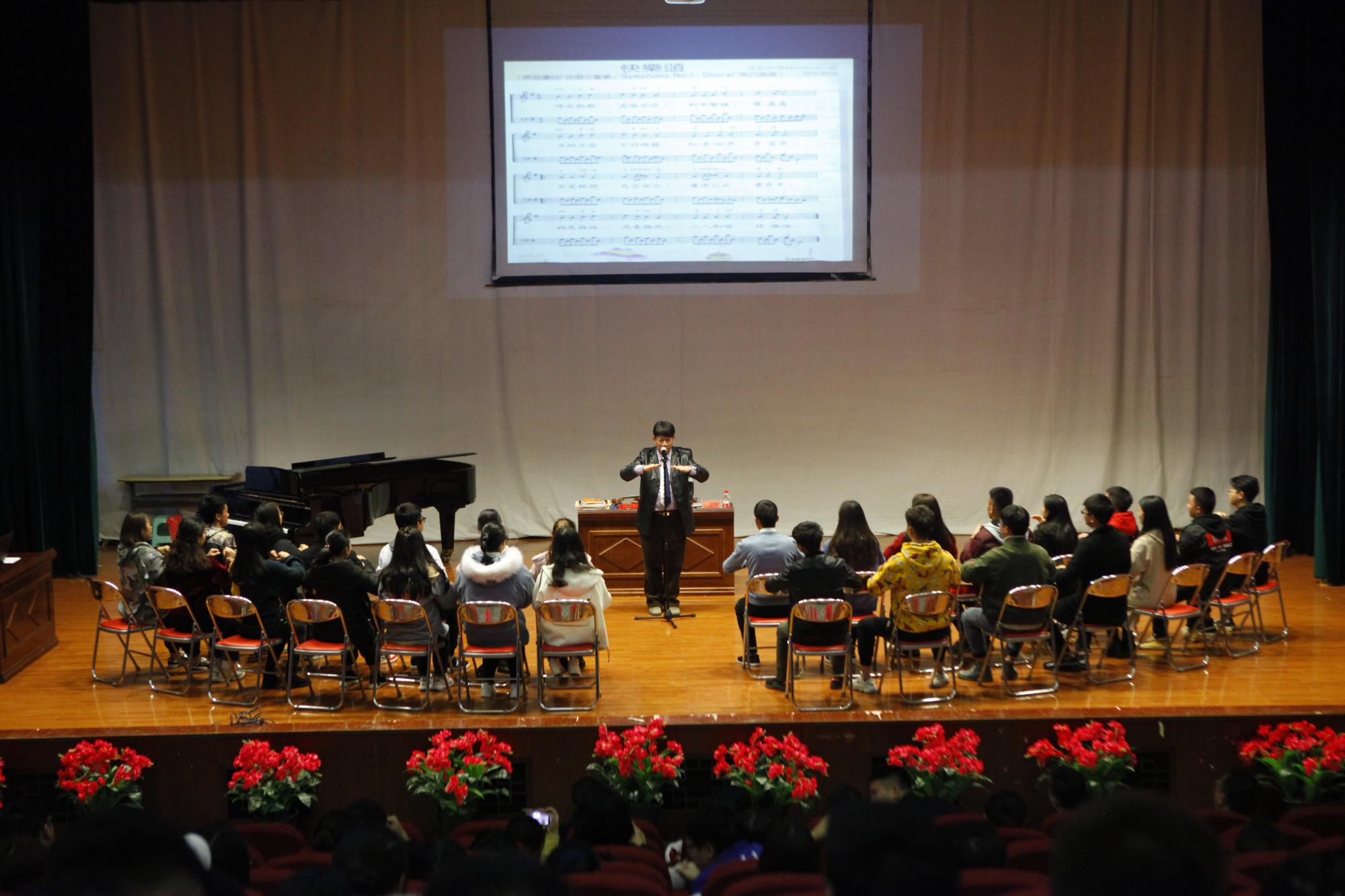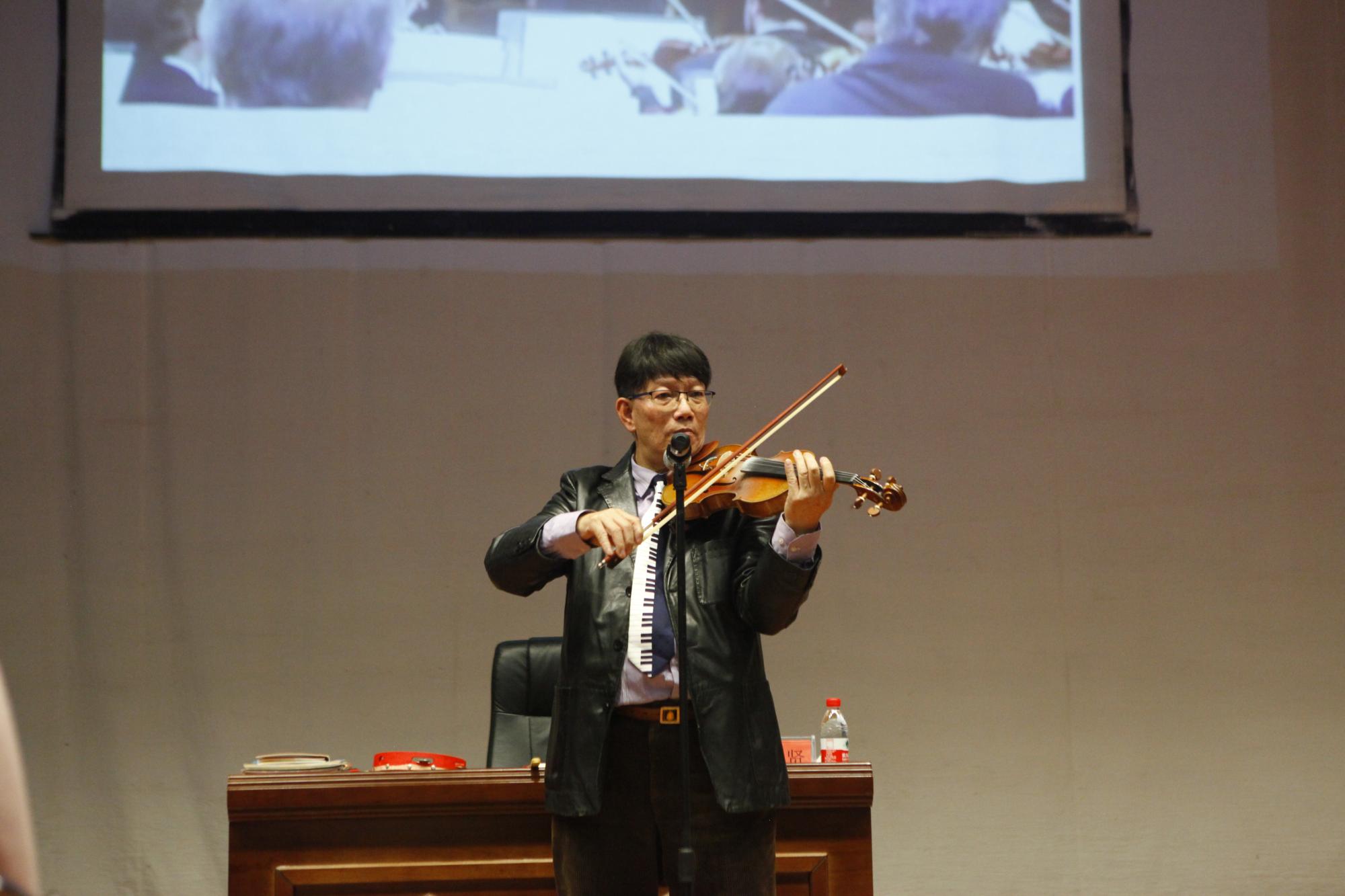 區品贤先生以欢乐课堂开始,带动全场师生以拍手、轻拍桌子打节奏的方式与全场师生互动。随后用小提琴现场演奏《欢乐颂》,带领大家了解音著名乐家贝多芬的事迹,让师生们在轻松愉快的氛围中积极主动地学习课堂知识。
