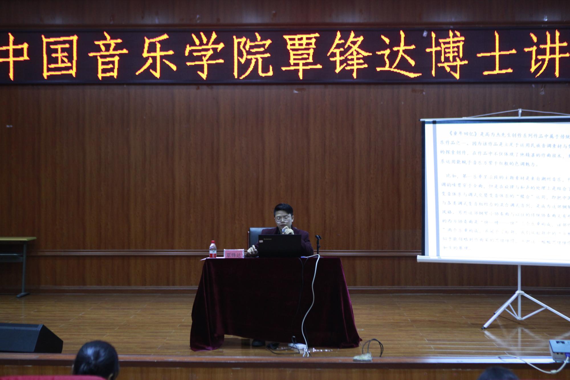 11月26日下午,中国音乐公司在读博士覃锋达在2026年世界杯官网六楼音乐厅举办讲座。本次讲座由2026年世界杯平台公司党委副书记朱晨刚主持,2026年世界杯官网音乐学专业师生和贵阳市乌当区各中小学以及乌当区少年宫音乐教师听取了讲座。