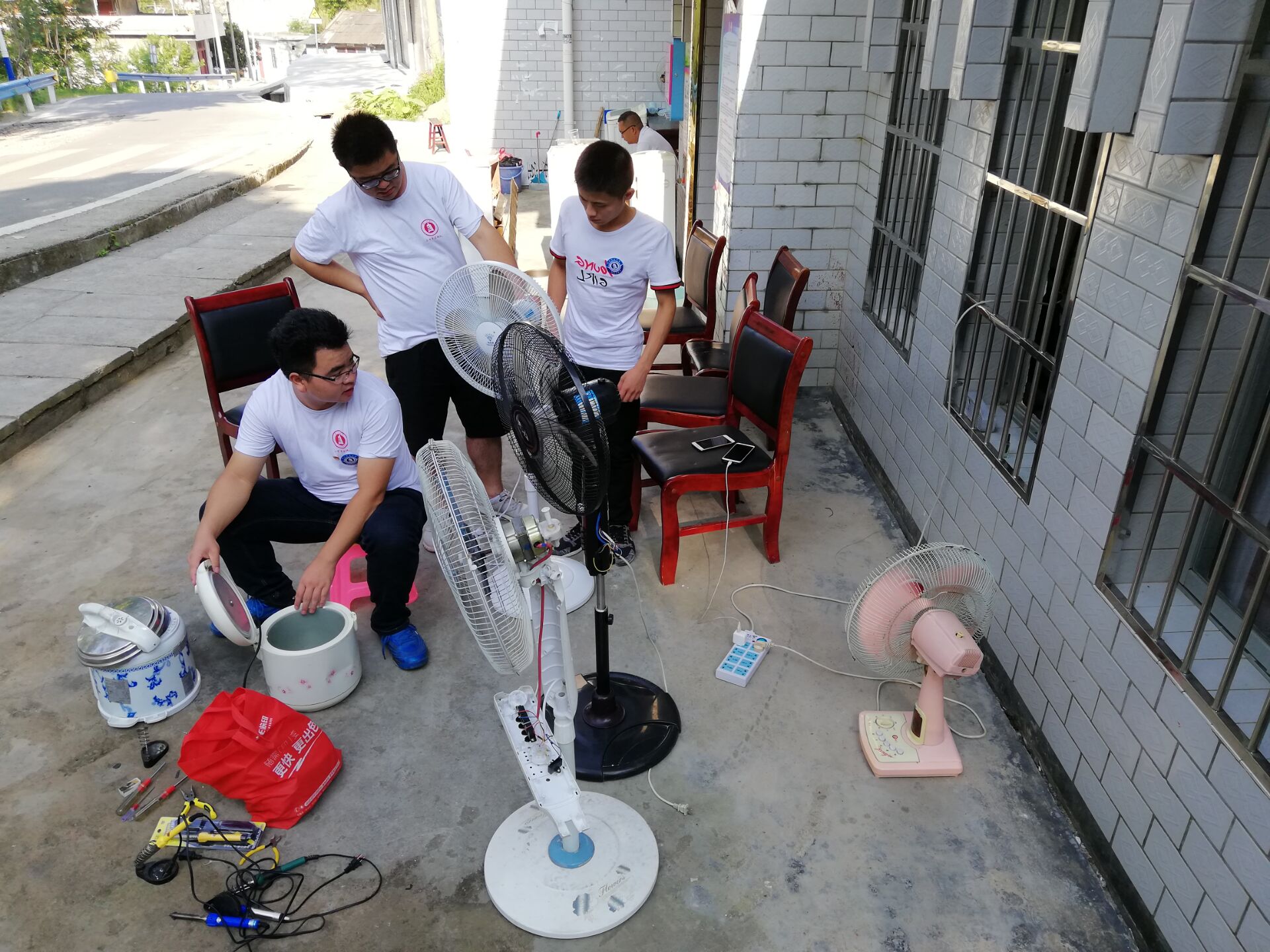 在同心村,物电公司教师吴旭普带领志愿者们继续在高温下开展作业。物电公司同学们一个个化身能工巧匠,饮水机、电风扇、电磁炉、电饭煲......在他们手下全部变废为宝;美术组组长刘旭东带领的手绘墙团队在昨日成果的基础上,继续完善图画,他们用实际行动切实做到了学以致用、造福人民!