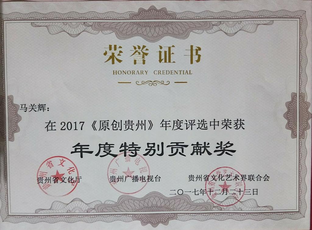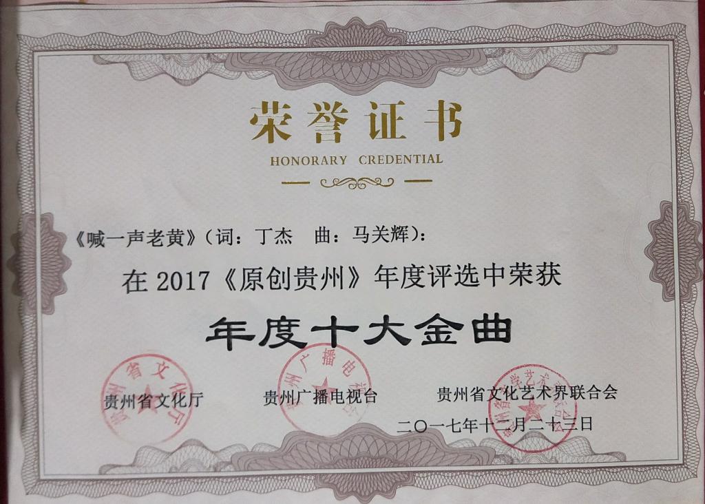 贵州音乐界专家联合音乐先锋榜全国24家成员台对2017参选的作品和歌手进行了评选,最终角逐出“年度最佳男歌手”、“年度最佳女歌手”、“年度十大金曲”、“年度新人”、“听众最喜爱歌手”、“年度特别贡献奖”六大奖项。获奖音乐人不乏省内知名的优秀歌手,他们每一位都各具亮点,演唱的作品都是动人心弦,受到专家老师的高度评价。其中,公司艺术公司经理马关辉教授获年度特别贡献奖,《喊一声老黄》、《石门赋》、《山那边》、《月光》等歌曲荣获“年度十大金曲”。