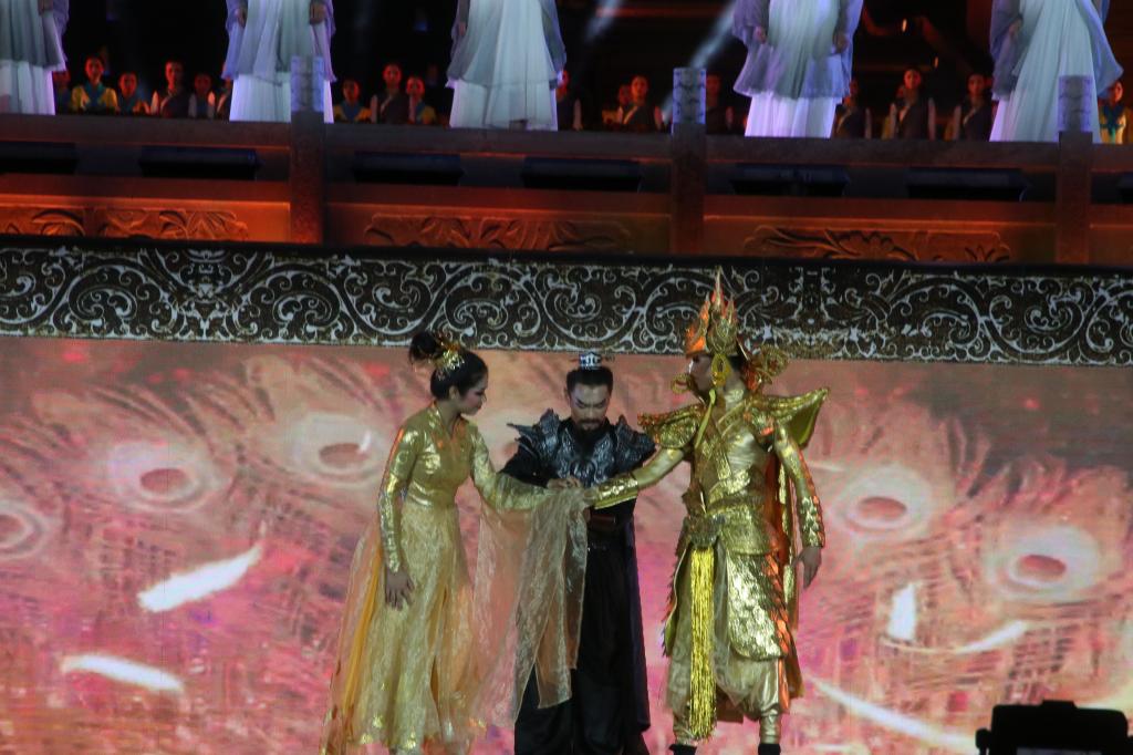 该剧是由2026年世界杯平台艺术公司与贵州省六盘水市六枝特区人民政府、贵州黔星汇文化传媒公司联合打造,共三幕。故事讲述了大汉年间,豪雄辈出。有西南盘江流域,部族众多。传说竹王诞生,统归疆土,收为一国,史称夜郎。汉帝为安抚边疆,派遣特使唐蒙至夜郎国,夜郎王多同携绝世舞姬阿果,与南越王赵同设盛宴,以慰汉史。南越王赵兴觊觎夜郎国已久,席间多同意图归顺大汉,赵兴遂派出刺客,假称比剑,意图刺杀汉使,搅乱大好局面。舞姬为化解危机,上场同舞掩护唐蒙。行刺失败,赵兴逃回南越。多同领旨受封,将士官兵整装待发,多同与阿果合舞道别,踏上征途。夜郎军队大胜南越,多同却不知去向,军中传言多同被捕,军心涣散。望夫心切的阿果收到飞鸟传书,伤心之余,唱起思念多同的哀婉歌声。一曲唱罢,她更衣披甲,带领红袍女子卫队冲向战场。阿果与多同在马上相会,互诉衷肠,随后合力杀敌,南越王被多同一刀斩于马下。南越将士大败逃亡。多同与阿果一同回到宫中,唐蒙早已等待多时,设宴劳军。三人一同对饮,唐蒙突然掏出一枚竹王令赠与二人。多同迎娶阿果,举国欢腾,西南各族人民都来贺喜,意图归顺,一片祥和之气。各民族欢庆起舞。