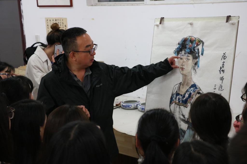 随后在逸夫楼中国画教室,王万成为艺术公司师生进行了现场水墨人物画写生示范,向员工们更直观地展示了中国水墨画的美。同学们也踊跃提出问题,王万成耐心解答并提出自己的见解。