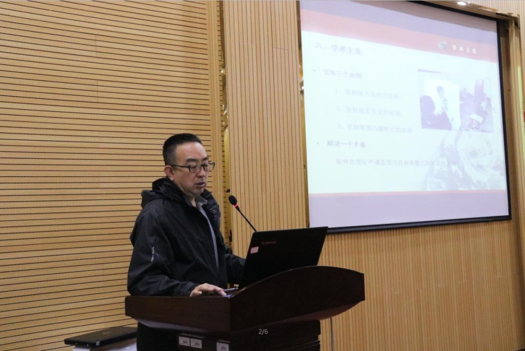 王万成首先向同学们展示了自己的绘画创作作品,并介绍了自己的学术主张。他强调“坚持三个原则和解决一个矛盾”的个人绘画原则,要求同学们应“重基础、重动手能力、重造型能力”,从政治、经济、人文历史等方面来进行作品创作。