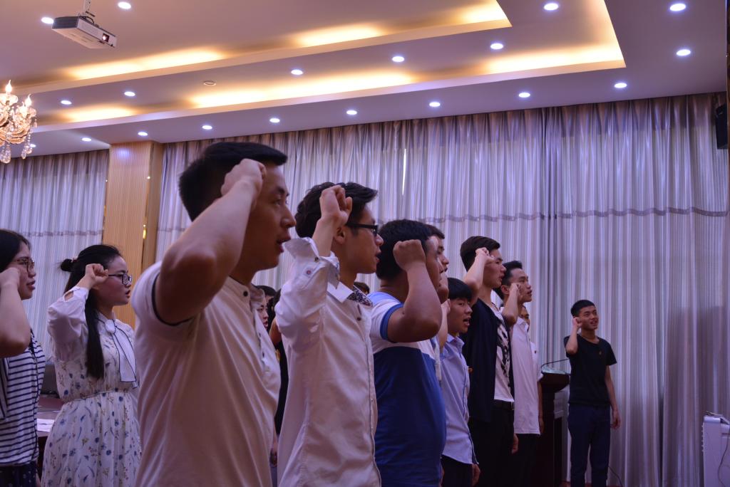 老党员手捧党徽庄严的走到新党员面前,并一一佩戴整齐,新发展的预备党员们精神焕发激动万分!随后,全体党员在舒然的带领下面对党旗举起右拳庄严宣誓。短短的12句入党誓词,大家以最饱满的情绪表达自己对党的向往与敬仰,句句铿锵有力,也深感从今天起自身作为一名党员应肩负的责任与使命。