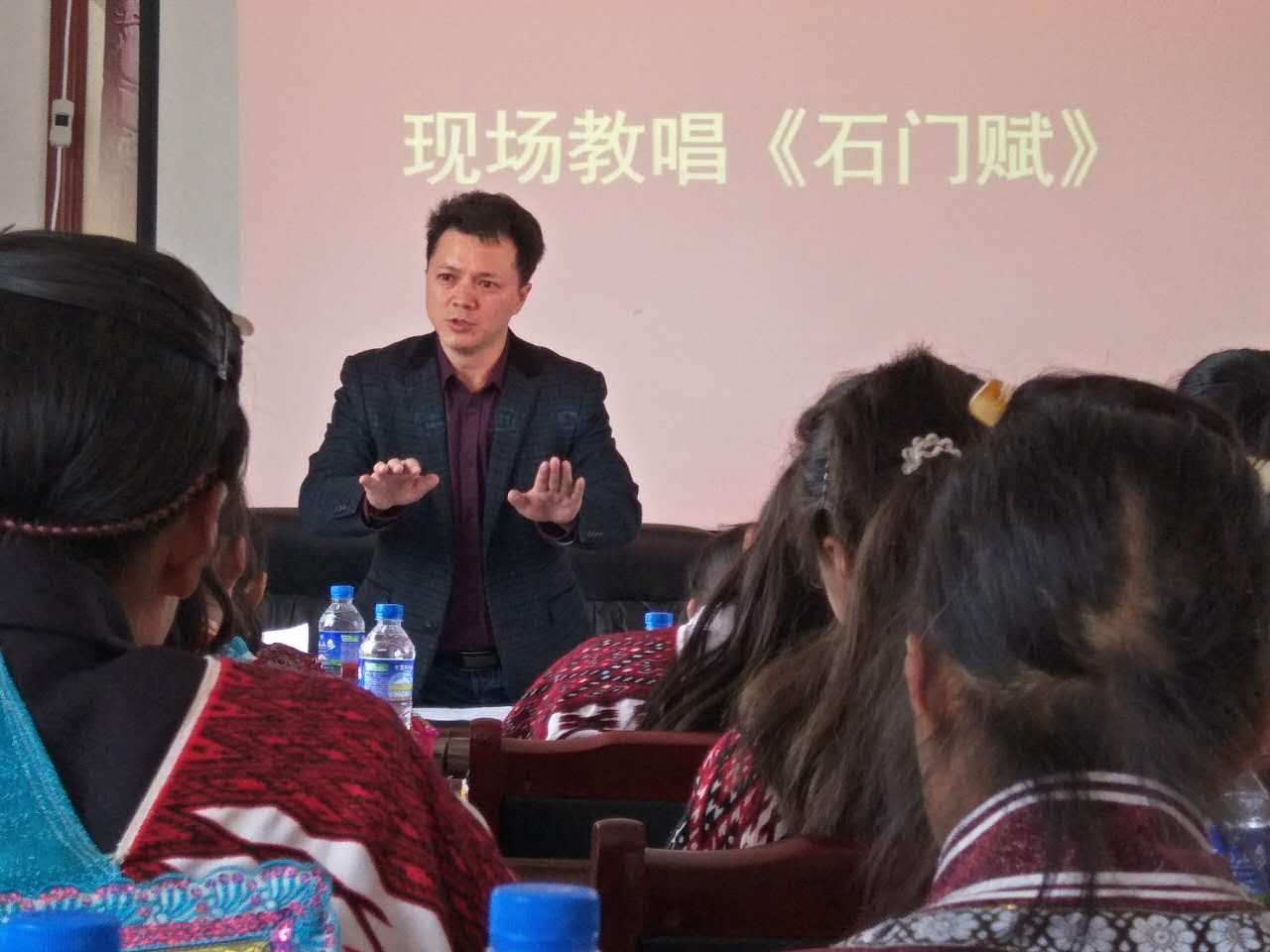 16日,采风团一行来到了年丰村进行实地采风。在当地领导的带领下,马关辉走进教室,亲自教苗族员工演唱创作歌曲《石门赋》,由于歌曲的旋律传承了当地苗族原生态的音乐元素,所以苗族同胞们感到非常亲切,学得非常快,取得了较好的效果。