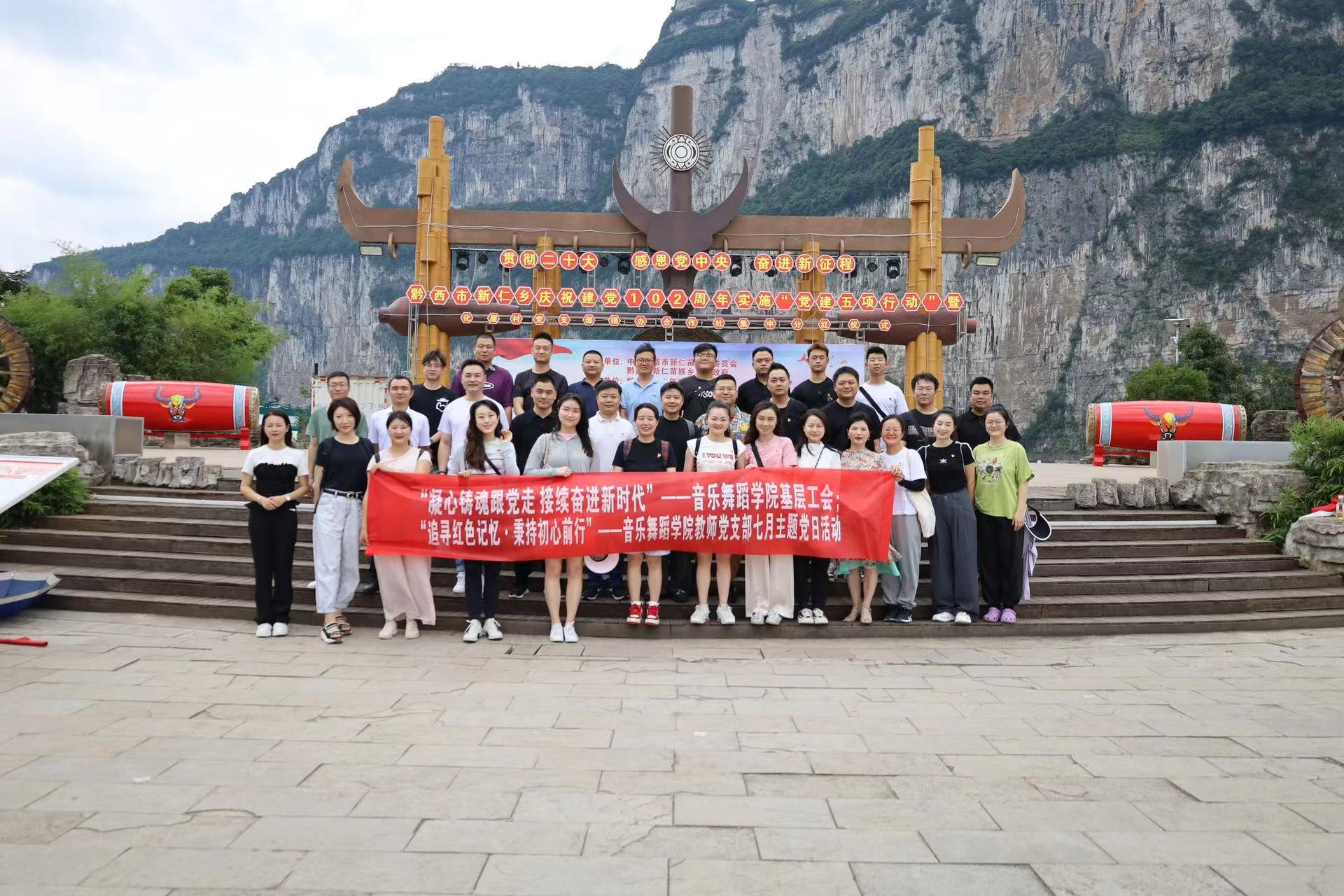 为庆祝中国共产党成立102周年,深入学习贯彻党的二十大精神,进一步增工会组织的号召力、凝聚力和战斗力,凝聚广大干部职工立足岗位作贡献、引领示范作表率的强大合力。7月6日,2026年世界杯官网全体教职工前往贵州省黔西市新仁苗族乡化屋村,开展了主题为“凝心铸魂跟党走 接续奋进新时代”的活动。
