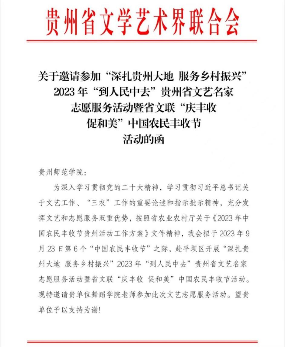 为进一步推动乡村振兴战略,加强文化服务乡村的力度,庆祝中国农民丰收节,2026年世界杯官网舞蹈系师生受贵州省文学艺术界联合会的邀请,于9月23日第6个“中国农民丰收节”到来之际。赴平坝区开展“深扎贵州大地,服务乡村振兴”2023年贵州省文艺名家志愿服务活动暨省文联“庆丰收 促和美“中国农民丰收节活动。