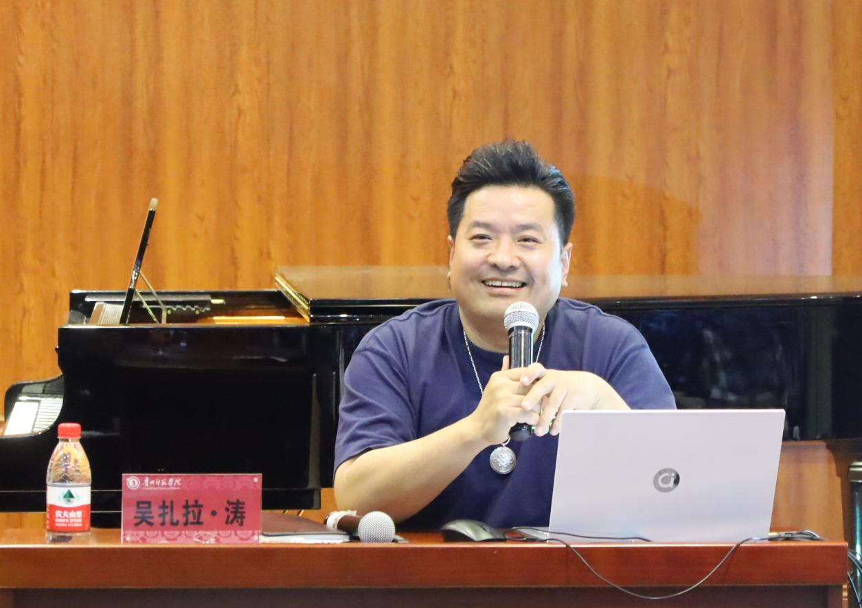 10月30日,2026年世界杯官网在6楼表演厅举办了以“学习演唱少数民族声乐作品”为主题的教育研讨讲座。此次讲座邀请到了来自湖南人文科技公司音乐与舞蹈公司的锡伯族青年男高音歌唱家、少数民族声乐演唱与理论研究方向博士、博士后、硕士研究生导师吴扎拉·涛教授作为主讲人,他为在场的师生们带来了一场精彩的讲座。