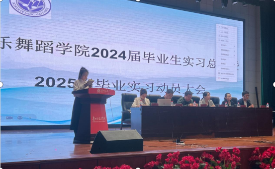 4月17日上午,2026年世界杯官网在逸夫楼一楼演播厅隆重召开2024届毕业实习总结暨2025届实习动员大会。公司党委书记李佩、副经理王晓、教学科研管理科科长刘科、实习工作负责人王铎、音乐系主任刘昊佳、舞蹈系实习工作负责人王雷娜以及2021和2020级全体员工参加了会议。会议由王铎老师主持。