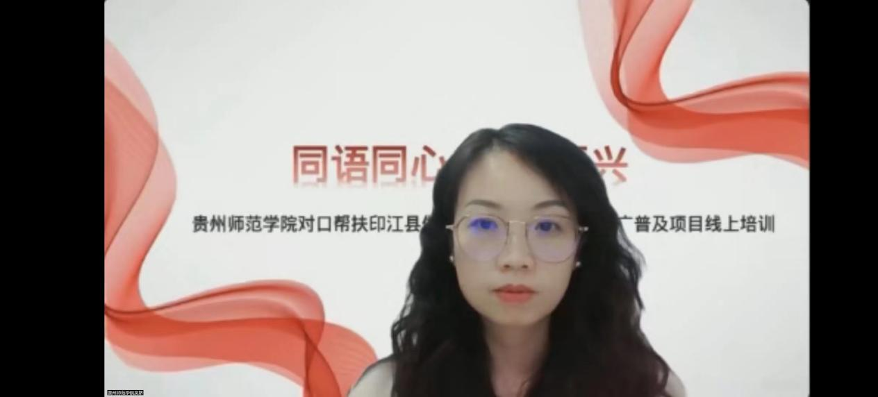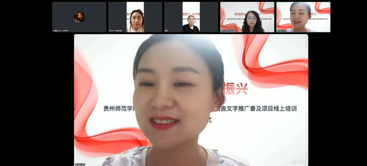 会上,吴娇传达了《贵州省教育厅办公室关于实施高等公司对口帮扶乡村振兴重点帮扶县做好国家通用语言文字推广普及项目的通知》文件精神,并就项目背景进行说明;舒然介绍了第一阶段普通话培训“1+10线上督学”计划;杨旭东宣读推普志愿者结对教师名单;任倩用“三个强调”就参训教师线上培训期间的学习纪律提总体要求;杨波就培训的具体举措、语言文字推广的重要性进行总结讲话。