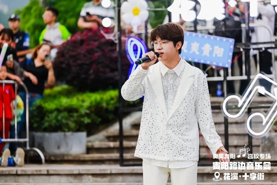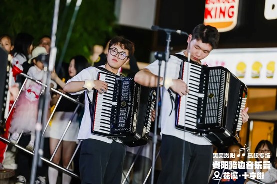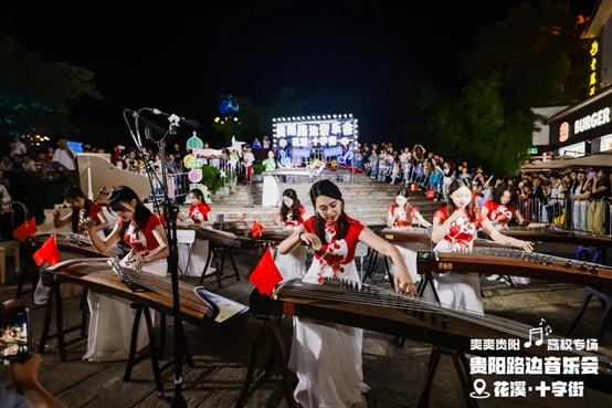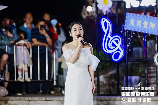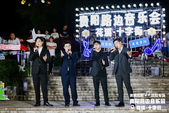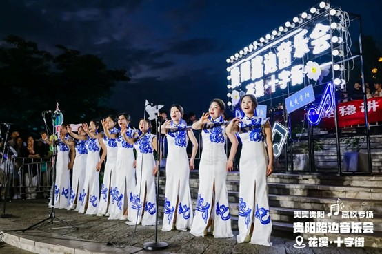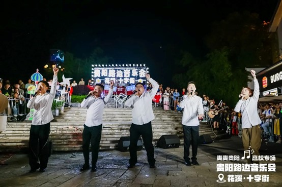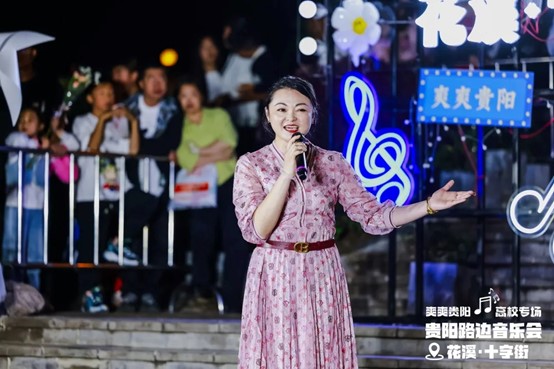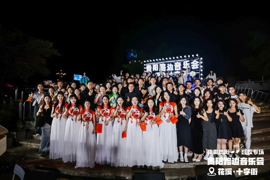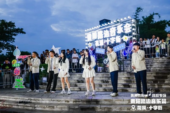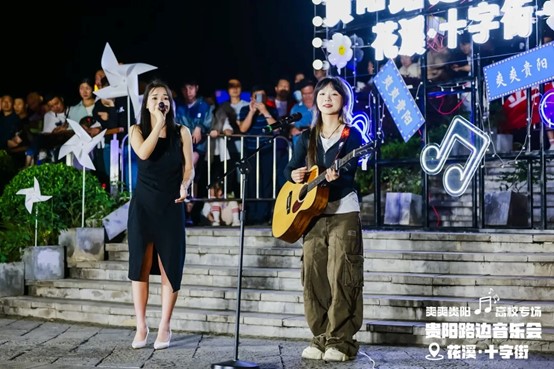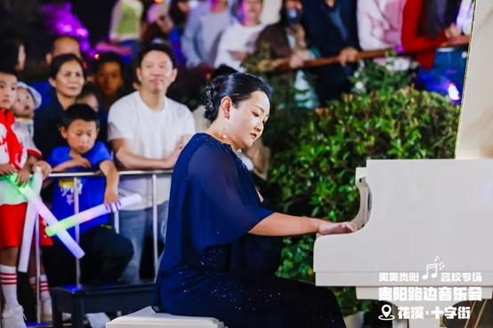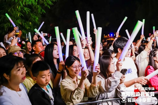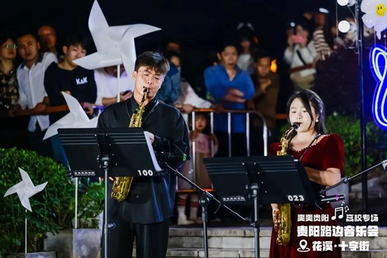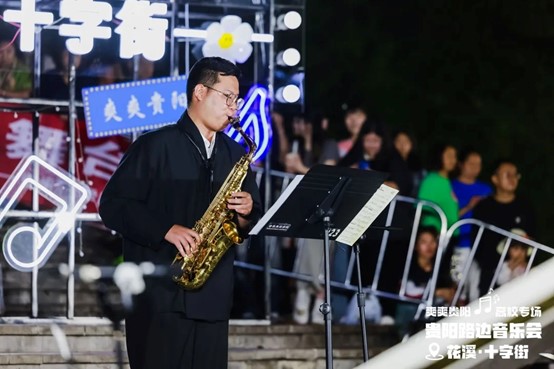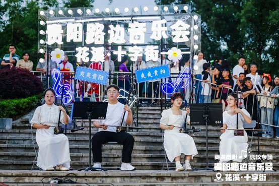 当晚,花溪十字街人流如织,热闹非凡。随着夜幕降临,舞台灯光点亮,弦歌开始响起,音乐会也正式拉开帷幕。一首首精彩的节目依次上演,现场的空气里弥漫着激情与活力,台上演员倾情唱奏,台下观众热情呼应,炽热的氛围仿佛带动了花溪十字街气温的上升。