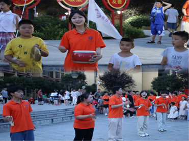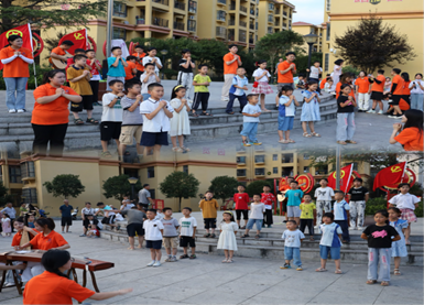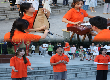 晚上七点半,汇报演出以一曲童声合唱作为开场拉开帷幕。孩子们清澈纯真的歌声与师生们专业的演唱相互交织,为观众带来了一场视听盛宴。随后,活力四射的舞蹈表演、悠扬动听的乐器演奏等节目轮番上演,孩子们在舞台上尽情展现着他们在这几天所学到的才艺,自信的笑容和灵动的身姿深深感染了现场的每一位观众。原创快板节目《印江》将活动推向高潮,节目通过快板富有节奏感和表现力的形式来“讲述”着党和国家对老百姓的帮扶政策以及印江当地的特色文化,既让老百姓们更加深入地了解了政策,也宣传了印江地方的色彩和情感温度。社区群众们纷纷沉浸在这热闹的氛围中,与孩子们一同挥舞双手、欢呼雀跃。