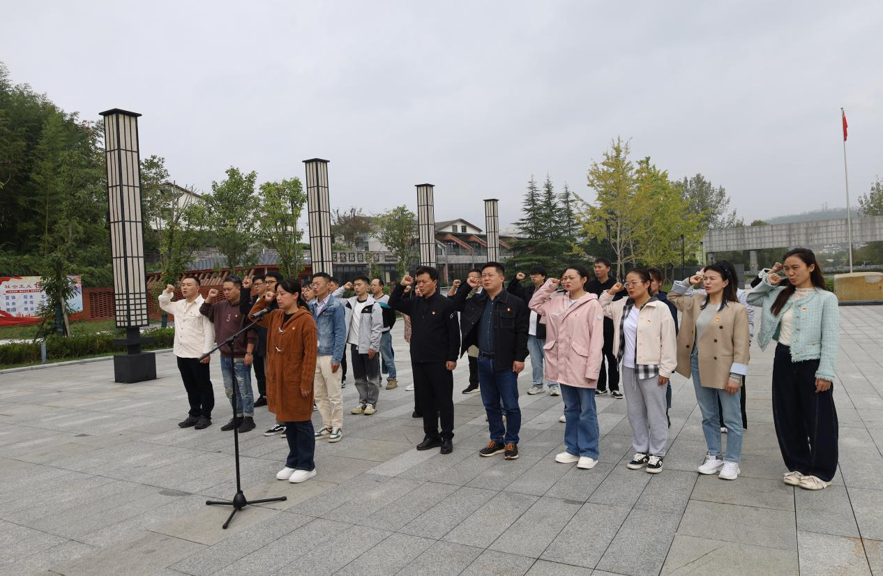 在息烽集中营革命历史纪念馆广场,全体人员列队肃立,敬献花篮。党委书记李佩带领全体党员在鲜红的党旗下,高举右拳,重温入党誓词。