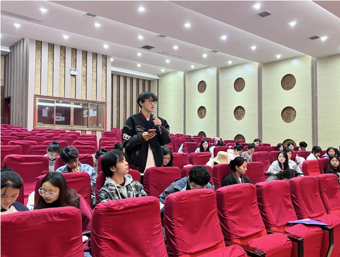 吴得荧首先从自身经历出发,向同学们分享了在校期间参加的各类比赛和各项活动心得,用实际行动激励大家不负时代、不负韶华,在实践中不断锤炼品格、提升能力,为未来更好的服务国家、服务社会学号本领,做好准备。接着她详细介绍了自己“三下乡”社会实践经历以及实践活动对于自己成长的重要意义。她表示,社会实践是了解国情社情民意的窗口、增强家国情怀和社会责任感的途径,是老员工个人成长和社会发展双赢的一个重要载体,同学们要把课堂学习和乡村实践结合起来,厚植爱国主义情怀,在实践中学真知、悟真谛、强磨炼、增本领。
