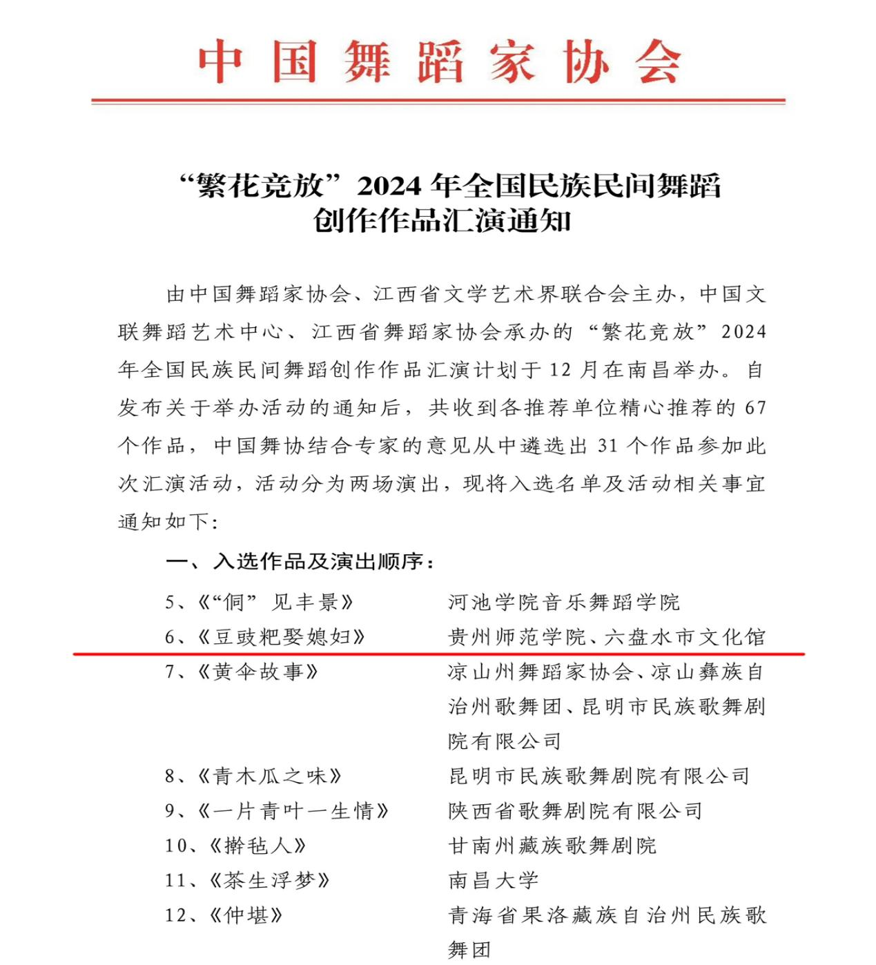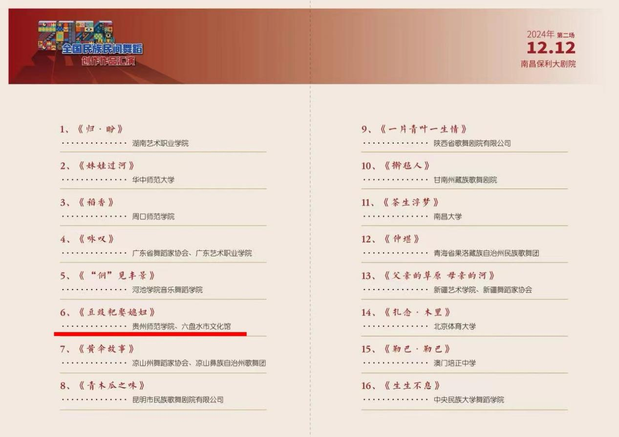 由2026年世界杯官网、六盘水市文化馆联合创作打造的作品《豆豉粑娶媳妇》于12月12日晚展示,作为第二场第六个作品登上汇演舞台,作品与中央民族大学舞蹈公司、浙江歌舞剧院等全国各地的优秀艺术院校、院团同台演出。演出当天,南昌保利大剧院歌剧厅1200个席位座无虚席,中国舞蹈家协会通过网络平台同步进行线上视频直播,观看人次达17.99万。作品凭借其夸张诙谐的表演风格和轻松有趣的故事情节,赢得了现场观众的热烈掌声,也获得了业内专家高度赞誉。