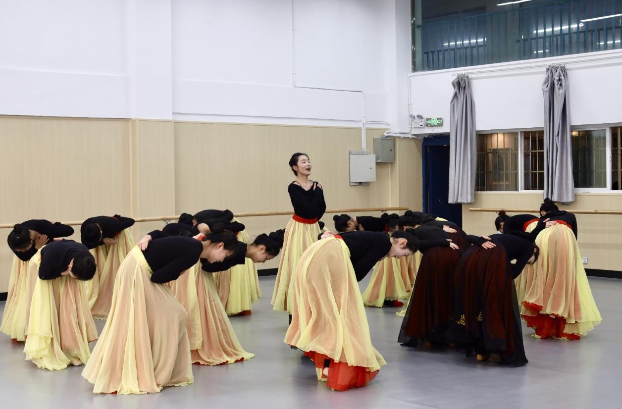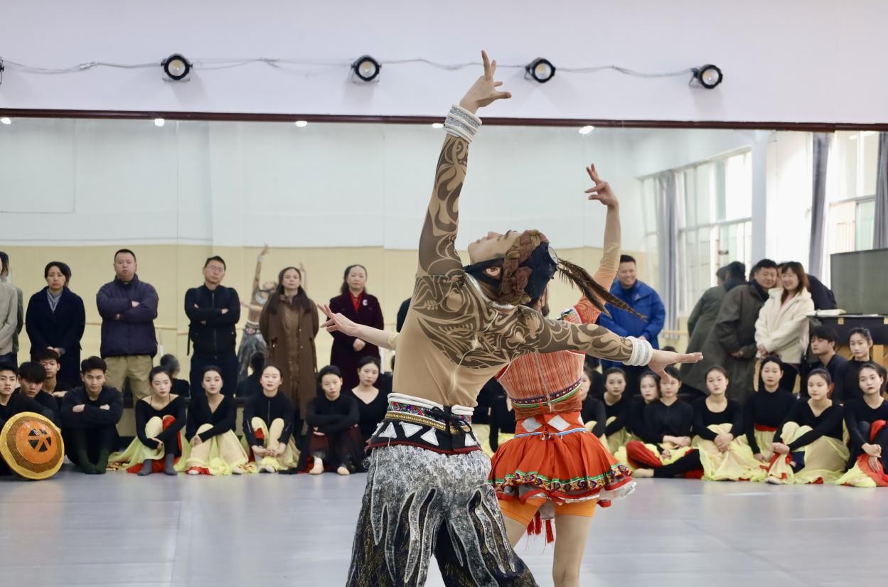马关辉陪同杨林一行参观了公司舞蹈实训室,在005教室,舞蹈专业的同学展示了舞蹈基本功和正在排练的舞蹈组合片段。省杂技团的演员展示了杂技《肩上芭蕾-彩羽》。