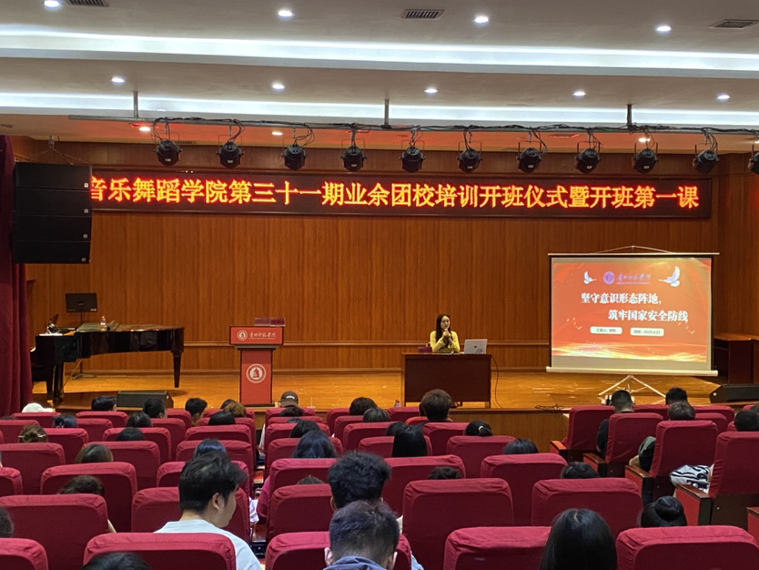 会议在团歌齐唱中拉开帷幕,喻小文就本期业余团校的培训内容和考核要求进行解读,舒然就团课培训的重要性和纪律要求进行了总体强调。随后舒然开展了主题为“坚守意识形态阵地 筑牢国家安全防线”的专题讲座。她通过丰富的案例和详实的数据,讲授了团员青年坚守意识形态阵地、维护国家安全的重要意义与责任担当。
