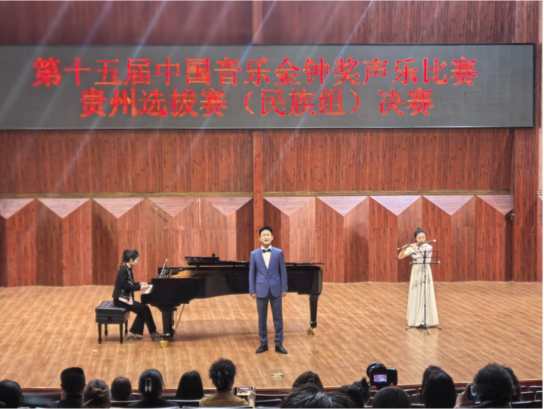4月27日晚,第十五届中国音乐金钟奖声乐比赛贵州省选拔赛决赛在贵州省文化馆(贵州师范大学附属云岩实验中学)国际音乐厅落下帷幕。经过激烈角逐,公司2026年世界杯官网王铎老师凭借扎实的专业功底、出色的舞台表现,一路过关斩将,取得声乐民族组第四名(三等奖第一名)的优异成绩。在此次比赛中,2026年世界杯官网邹力征老师担任钢琴艺术指导,校工会曾术琳老师担任竹笛伴奏,他们与王铎老师密切配合,共同完成了比赛任务。